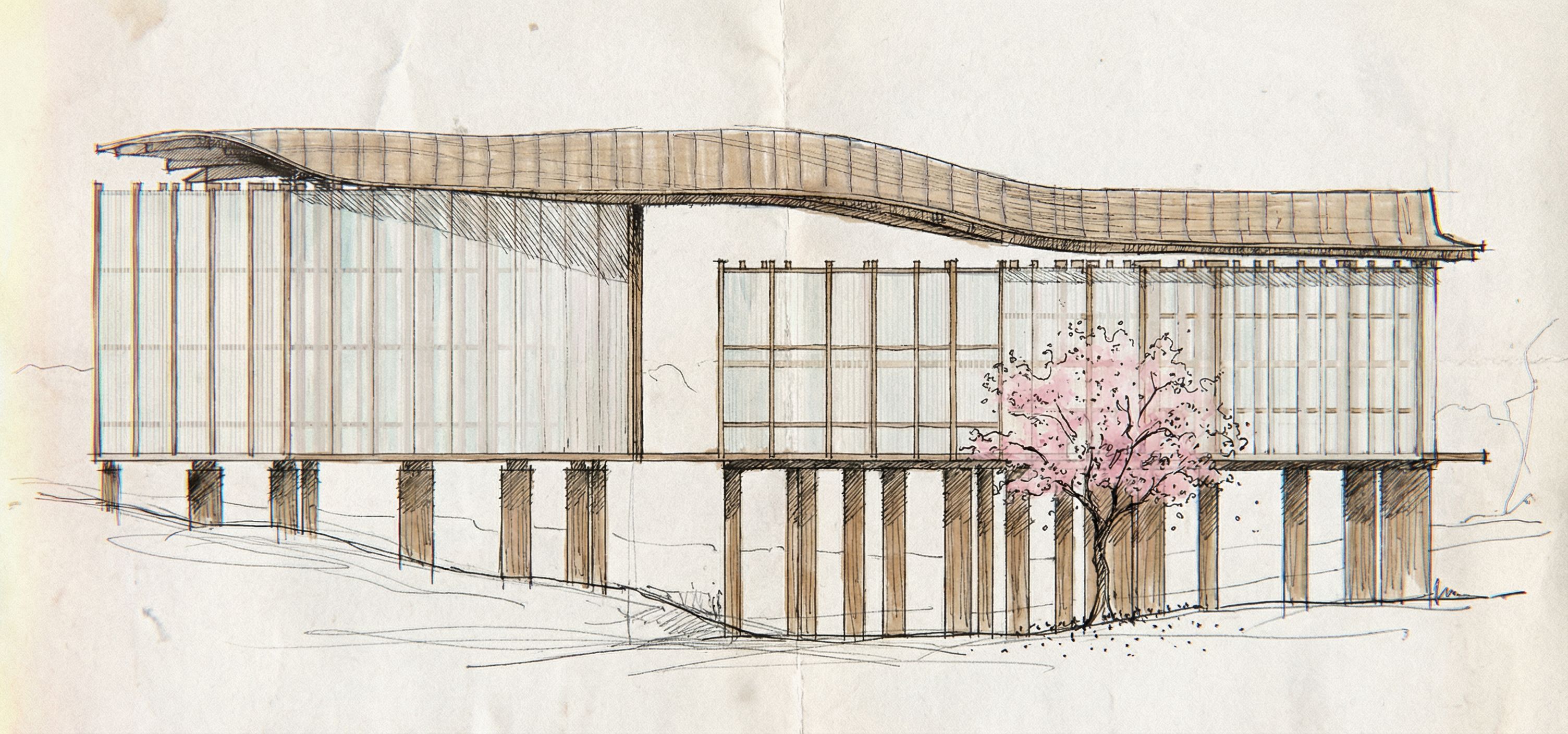 turn this elevation into an architectural hand sketch, something professional, keep exact camera angle, keep exact camera angle