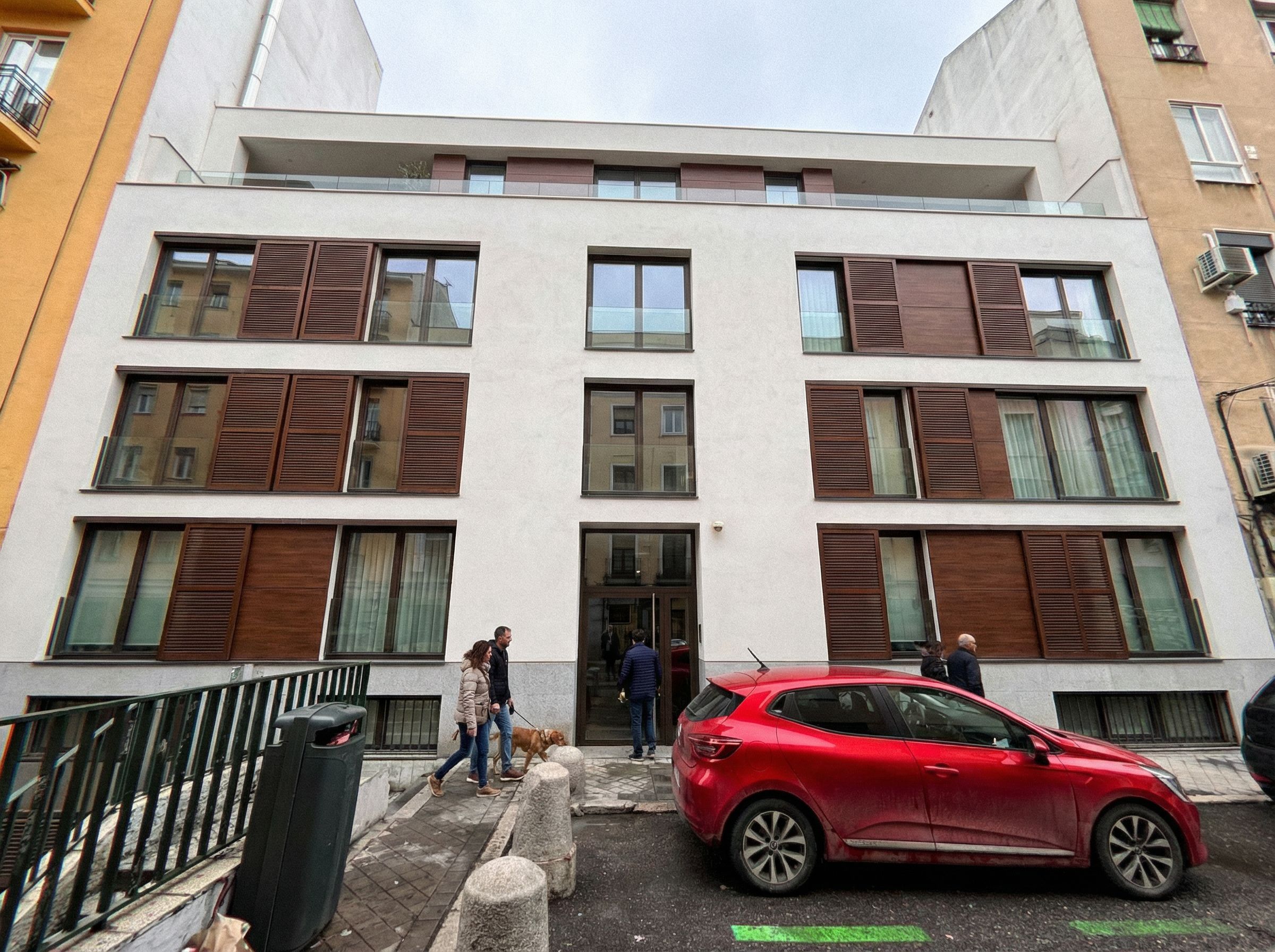Edificio moderno, en tonos blancos con contra ventanas de madera, un semisotano, 3 plantas y una ultima planta retranqueada, keep exact camera angle