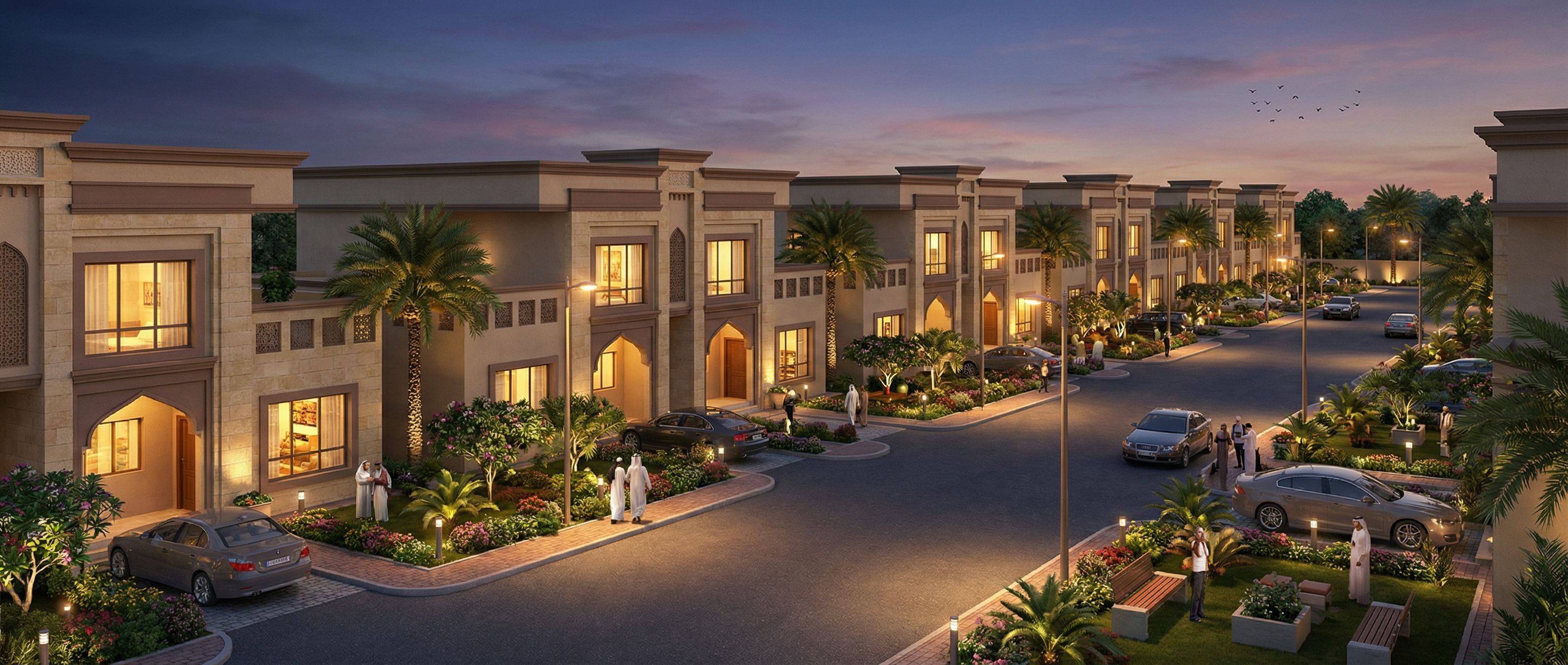 architectural exterior rendering, render this photo into photorealistic rendering, WARM SUMMER EVENING WITH LIGHTS TURNED ON IN THE HOUSES. INCLUDE GARDEN LIGHTS AND STREET LIGHTS. THE DESIGN SHOULD HAVE AN ARABIC STYLE AND THE BUILDING BEIGE IN COLOUR BUT SLIGHTLY DARKER ON THE MOULDINGS. INCLUDE LANDSCAPING WITH MORE PALM TREES IN THE LANDSCAPE. SOME BIRDS IN THE SKY., keep exact camera angle, dusk atmosphere with soft lighting, including people, vehicles, greenery and vegetation, trees, street furniture, high quality, professional, detailed scene