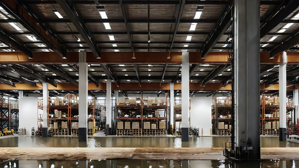 PromptIndustrial warehouse with wood structure und water on the floor. Lots of heavy Maschines.