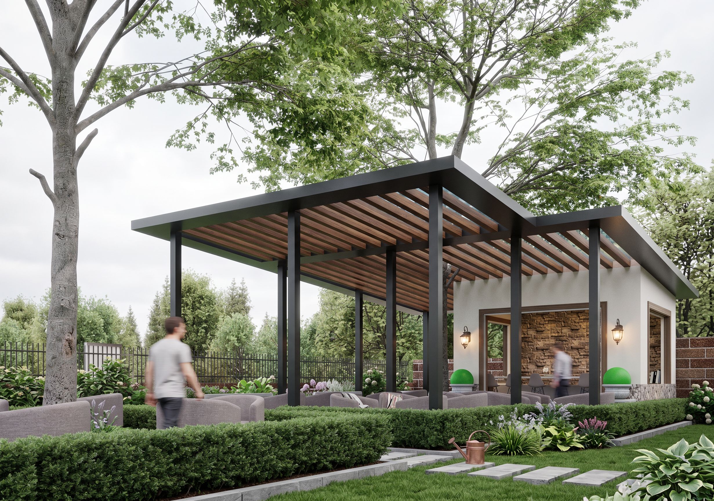 Photo of a modern residential pavilion featuring sleek metal framing and an expansive roof supported by slender columns. Surrounding elements include a textured stone wall and manicured grass, complemented by vibrant landscaping and neatly trimmed shrubs. Natural lighting prevails, casting soft shadows on the façade during the afternoon. Captured from a low angle to emphasize the building’s height and openness, with a wide lens creating a spacious atmosphere that invites viewer engagement.