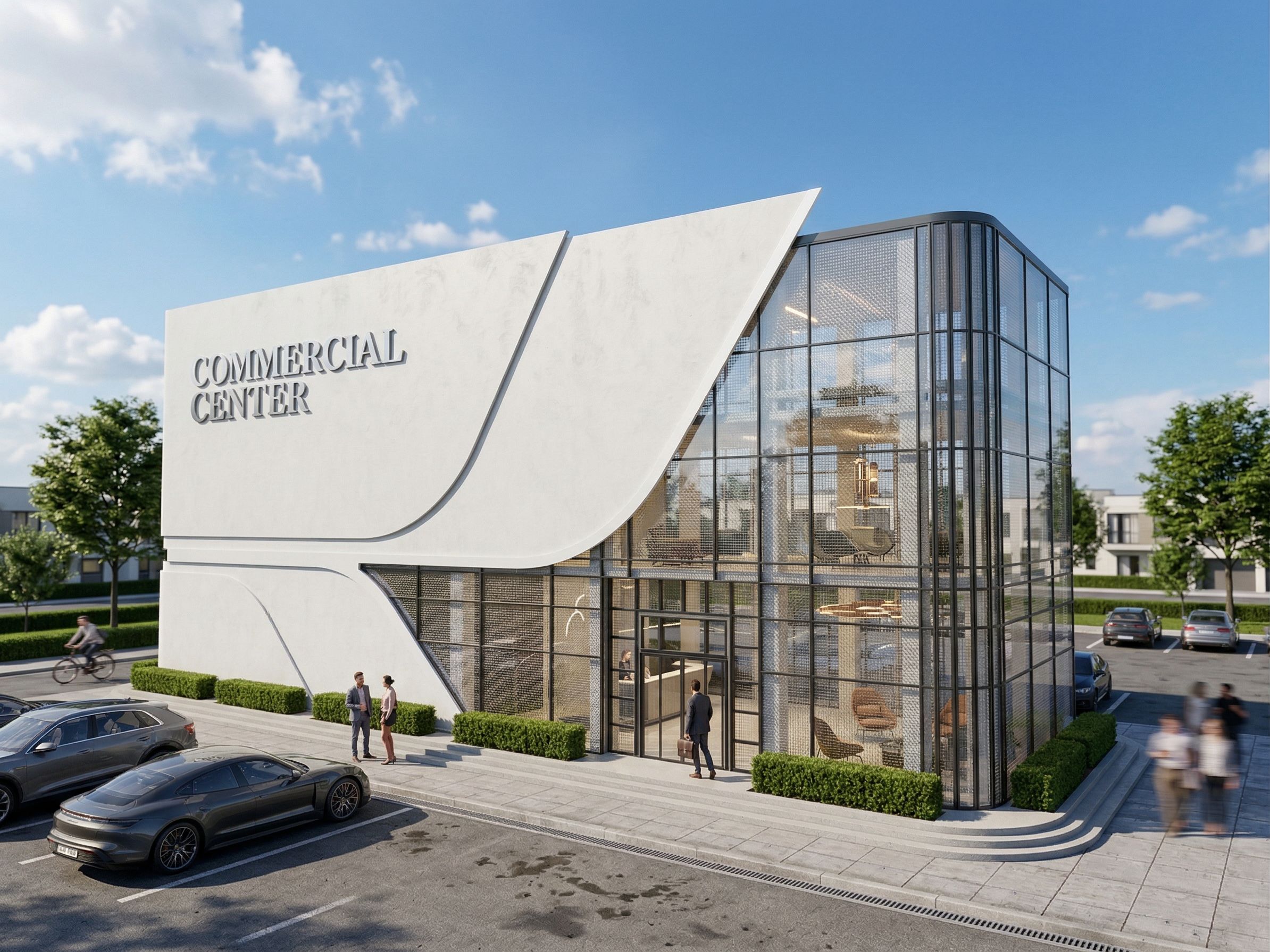 PromptEnhance this modern minimalist commercial building render to ultra photorealistic quality while preserving the exact original architecture, massing, proportions, and facade design. Do not modify or redesign any part of the building. Apply high-end realistic materials: - smooth white concrete or microcement facade with subtle texture and imperfections - large glass panels with realistic reflections and strong interior visibility - clean metal framing with soft reflections Lighting: ;- warm golden hour sunlight sunset with soft long shadows - realistic sky with soft clouds and atmospheric depth - global illumination with natural light bounce - warm interior lighting visible through the glass Environment: - realistic parking asphalt with natural imperfections and reflections - detailed sidewalk with subtle texture ;- clean landscaping with trimmed bushes and natural trees Realism: - realistic people with natural poses and accurate scale ;- high-end cars with reflections, shadows, and slight الضوء الخلفي10;- subtle imperfections to avoid overly perfect CGI look 10;Details: ;- luxury storefront feel clean glass, soft interior lighting, premium look ;- realistic reflections on glass and cars - balanced exposure and contrast not overexposed - sharp but natural edges Camera: ;- eye-level cinematic perspective - very subtle depth of field - HDR, 8K resolution, ray tracing, global illumination IMPORTANT: Do NOT change the design, facade, or structure of the building. Do NOT add or remove architectural elements. Only enhance realism, lighting, and materials. , keep exact camera angle