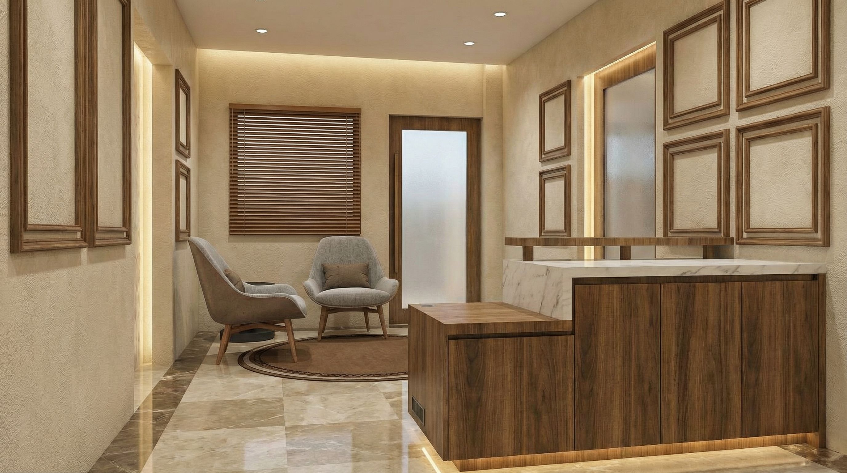 interior design rendering, render this 3D mass into photorealistic rendering, interior design rendering, render this 3D mass into photorealistic rendering, Photo of an interior jewelry showroom featuring a modern reception desk with a combination of warm wood and sleek marble materials. Walls adorned with empty wooden frames give a bespoke feel. The space is illuminated by soft ambient lighting, enhancing the textures of the surfaces. Shot from a slightly elevated angle to capture the reception area with the elegant chair facing the desk, using a 35mm lens to provide depth and focus on design details. The overall ambiance suggests luxury and sophistication within an urban context. flooring is two coloured italian marble one being beidge and other being armani brown , keep exact camera angle, high quality, professional, detailed scene, keep exact camera angle, high quality, professional, detailed scene