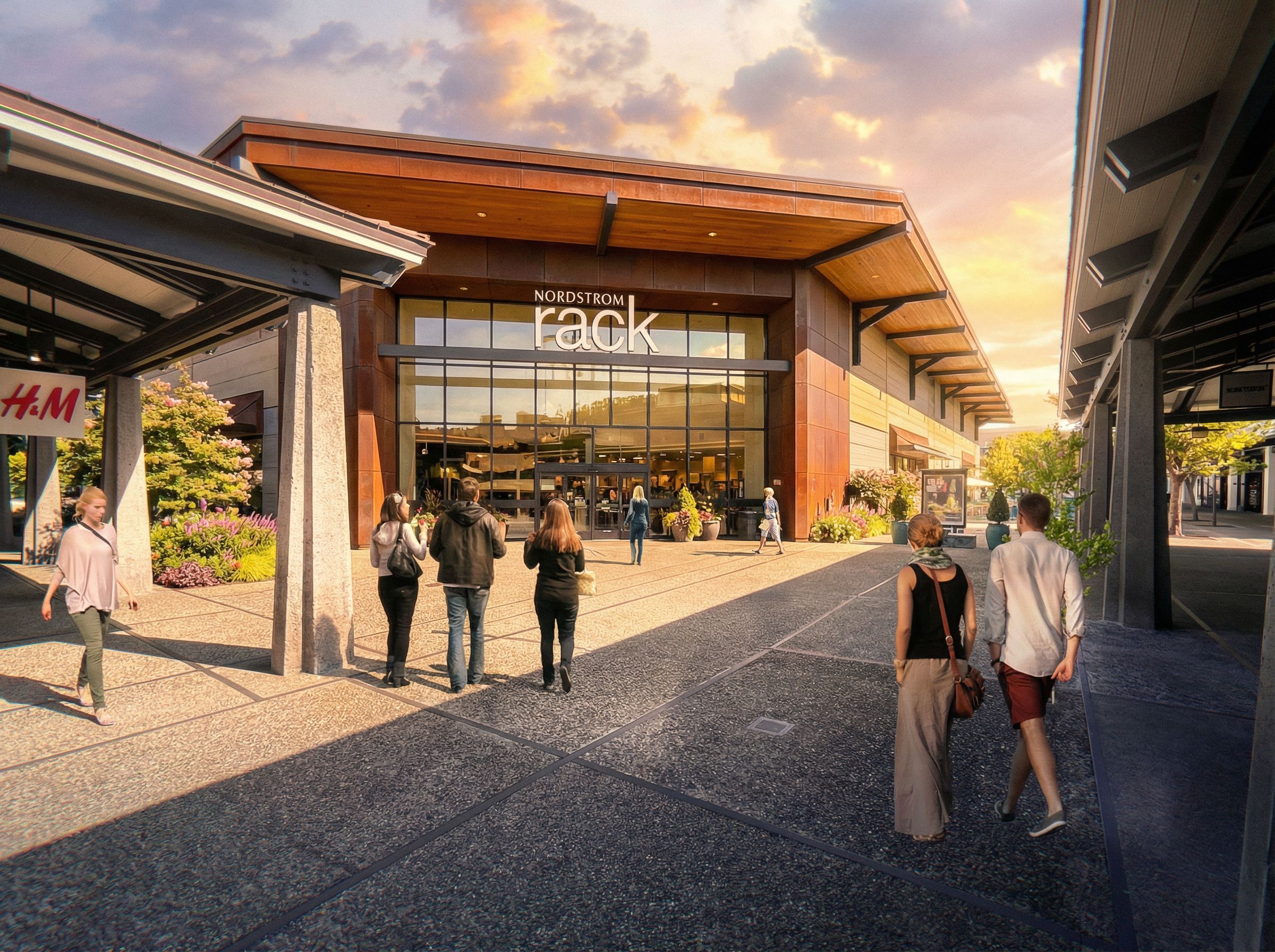 Photo of a modern retail complex façade featuring large glass windows and an inviting entrance, showcasing sleek architectural lines and a combination of wood and steel materials. The urban environment includes shoppers walking along a well-paved plaza, surrounded by landscaped elements and stores with vibrant signage. Natural lighting illuminates the scene during golden hour, casting soft shadows. Captured from a low-angle perspective to enhance the grandeur of the design and convey an engaging atmosphere., keep exact camera angle