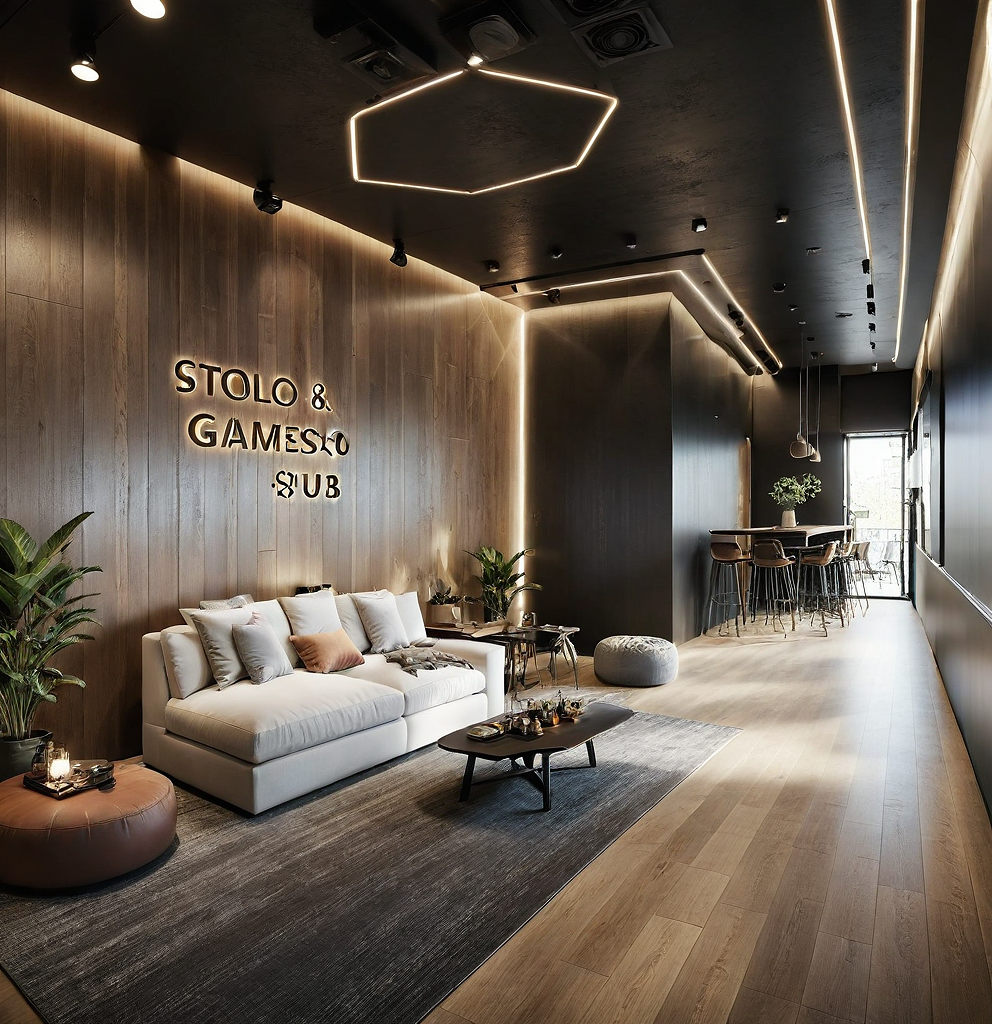 Promptcreate a realistic image of a space to play video games. A modern and contemporary space, with beautiful light from a sunny day