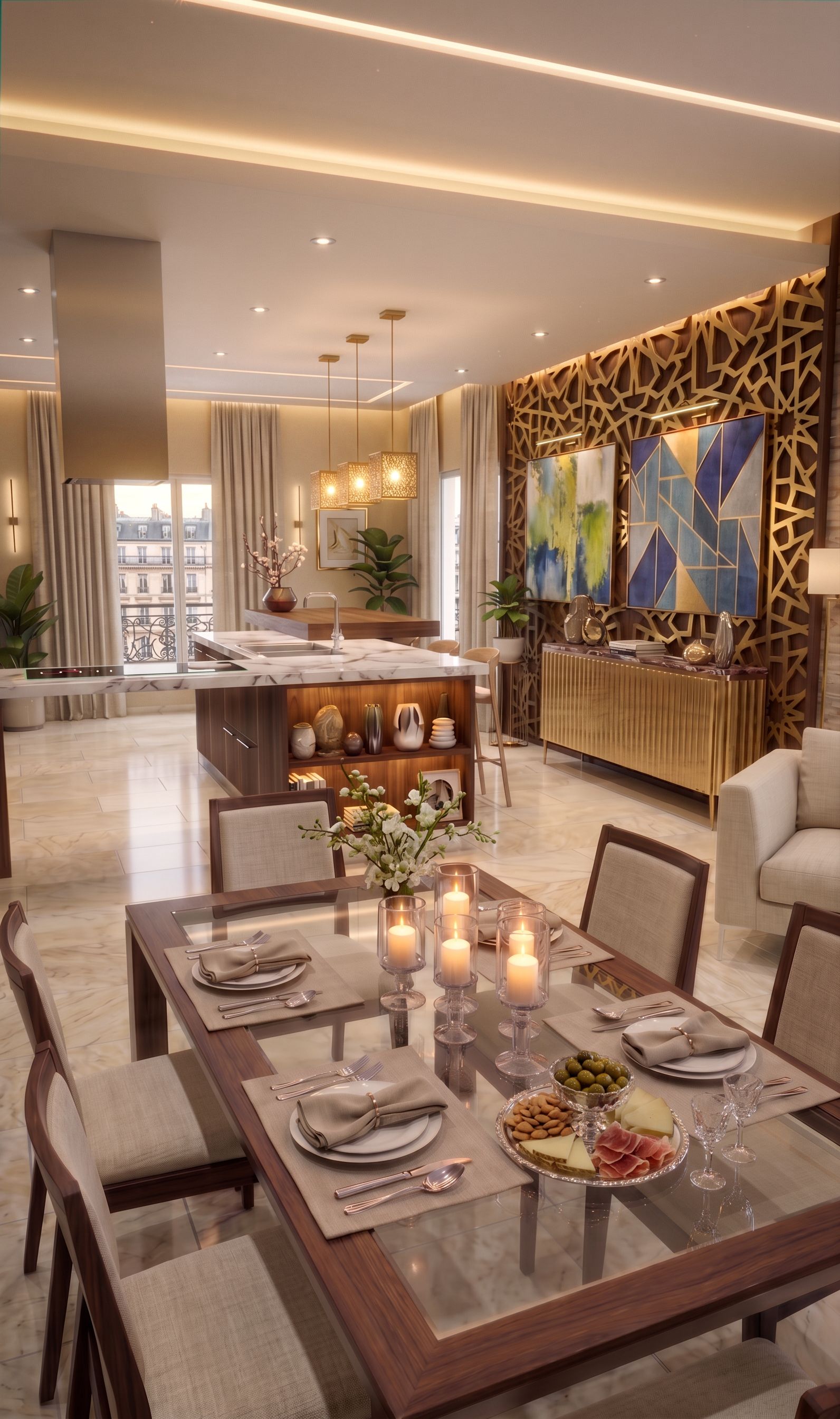 Promptcambia la pared del fondo por una sin textura y de color crema medio añade comida para picar antes de comer pero de forma elegante. Al panel texturado de la pared de la derecha cambia el color del motivo texturado a dorado y el fondo de la pared del mismo color marrón que ya está., keep exact camera angle