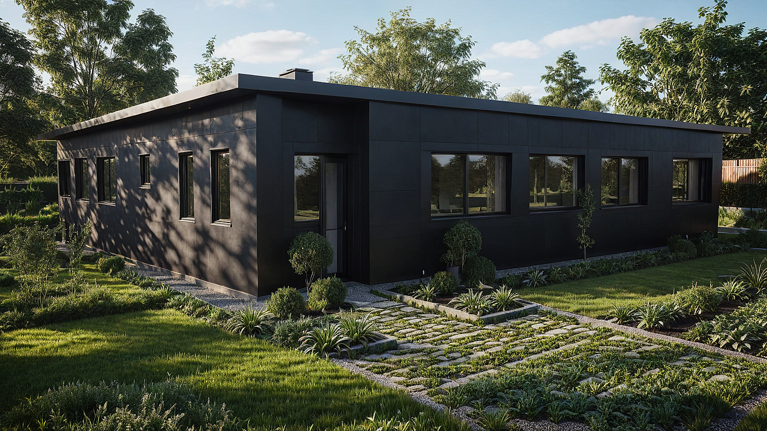 black house with garden