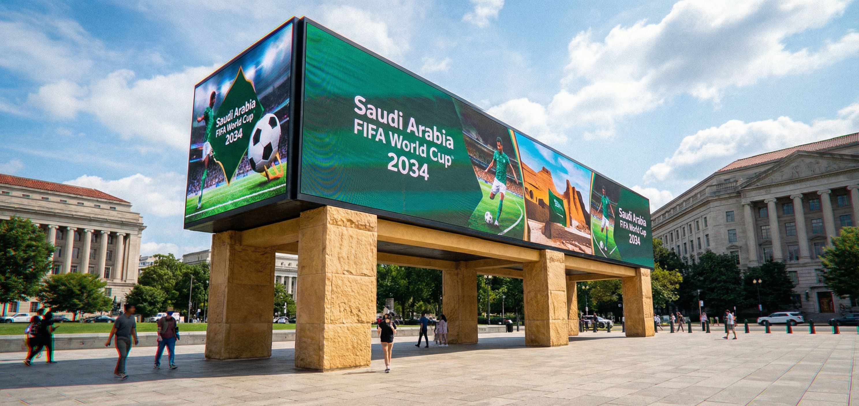 keep exact camera angle , BLACK IS SCREEN , YELLOW IS Riyadh stone , Washington DC , PUT Saudi Arabia FIFA World Cup 2034 ads ON SCREEN,, keep exact camera angle