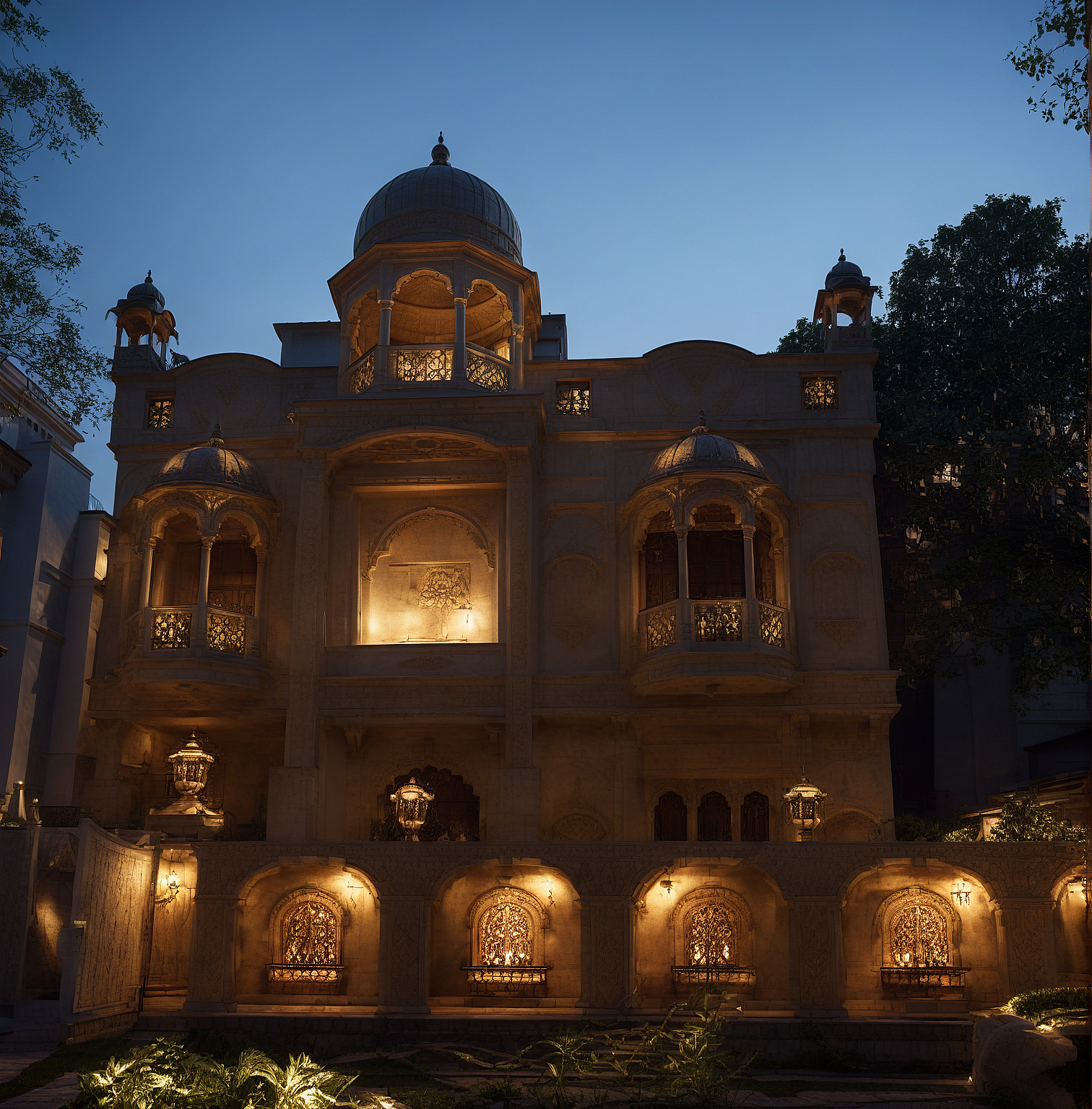 PromptRender a heritage-style building at night with soft, indirect warm lighting. Use golden ambient illumination to subtly enhance intricate carvings, domes, and balconies. Ensure the lighting appears naturally diffused, emanating from hidden sources. Create a balanced contrast between the warm glow and the cool evening environment. Enhance textures with realistic depth, ensuring shadows and highlights bring out the architectural richness. The overall ambiance should feel grand, sophisticated, and timeless, with an inviting yet dramatic lighting effect