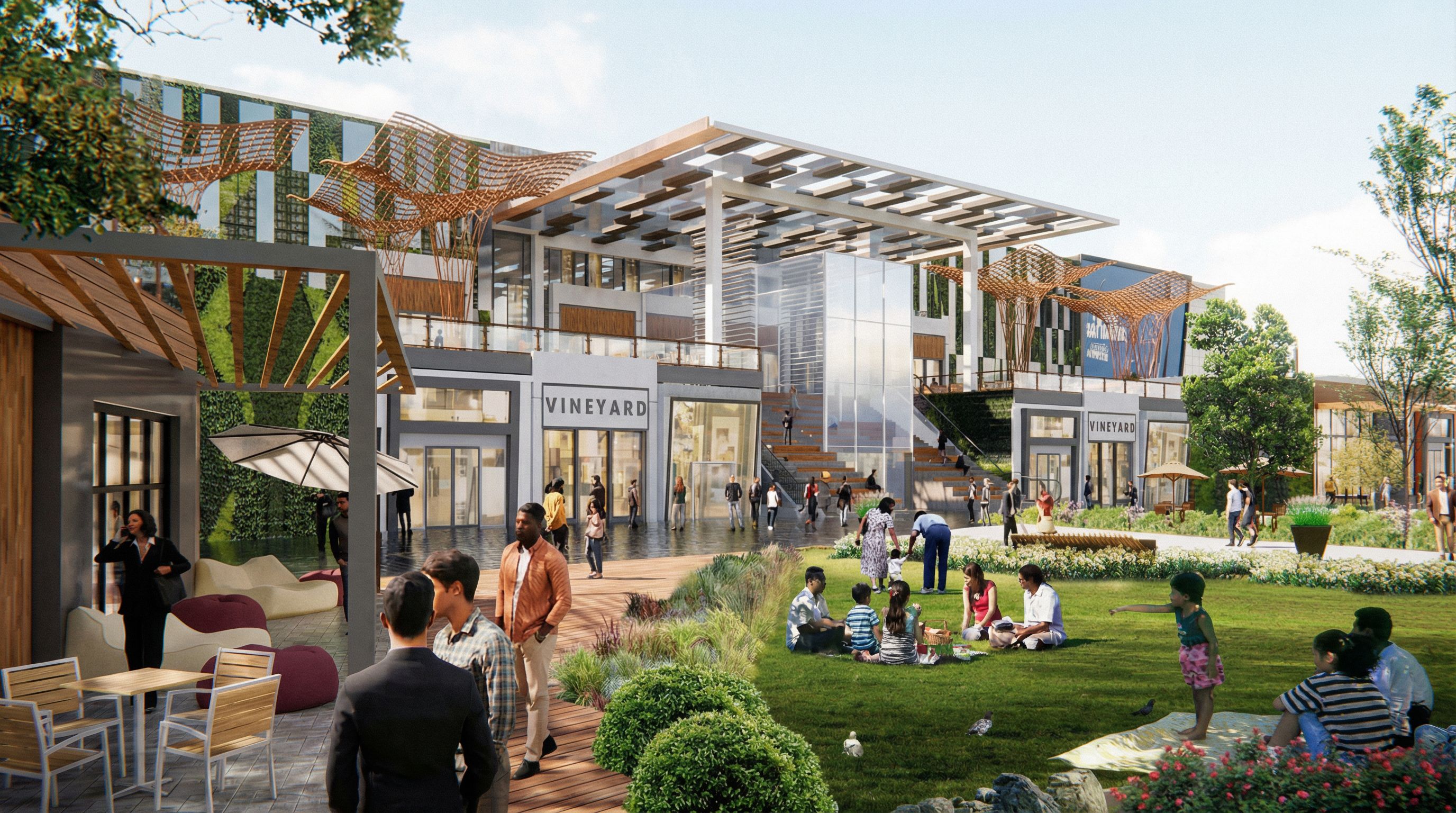 PromptPhoto of a modern retail complex featuring sleek storefronts and vibrant outdoor spaces. Emphasize the glass facade, wooden accents, and unique canopy structures. Urban setting includes lush landscaping with green patches and a serene walkway. Natural sunlight casts soft shadows, highlighting details in the architecture. Capture the scene from a low-angle perspective, using a wide-angle lens to showcase the depth of the space and the interactions of people enjoying the ambiance, creating a lively, inviting atmosphere., keep exact camera angle