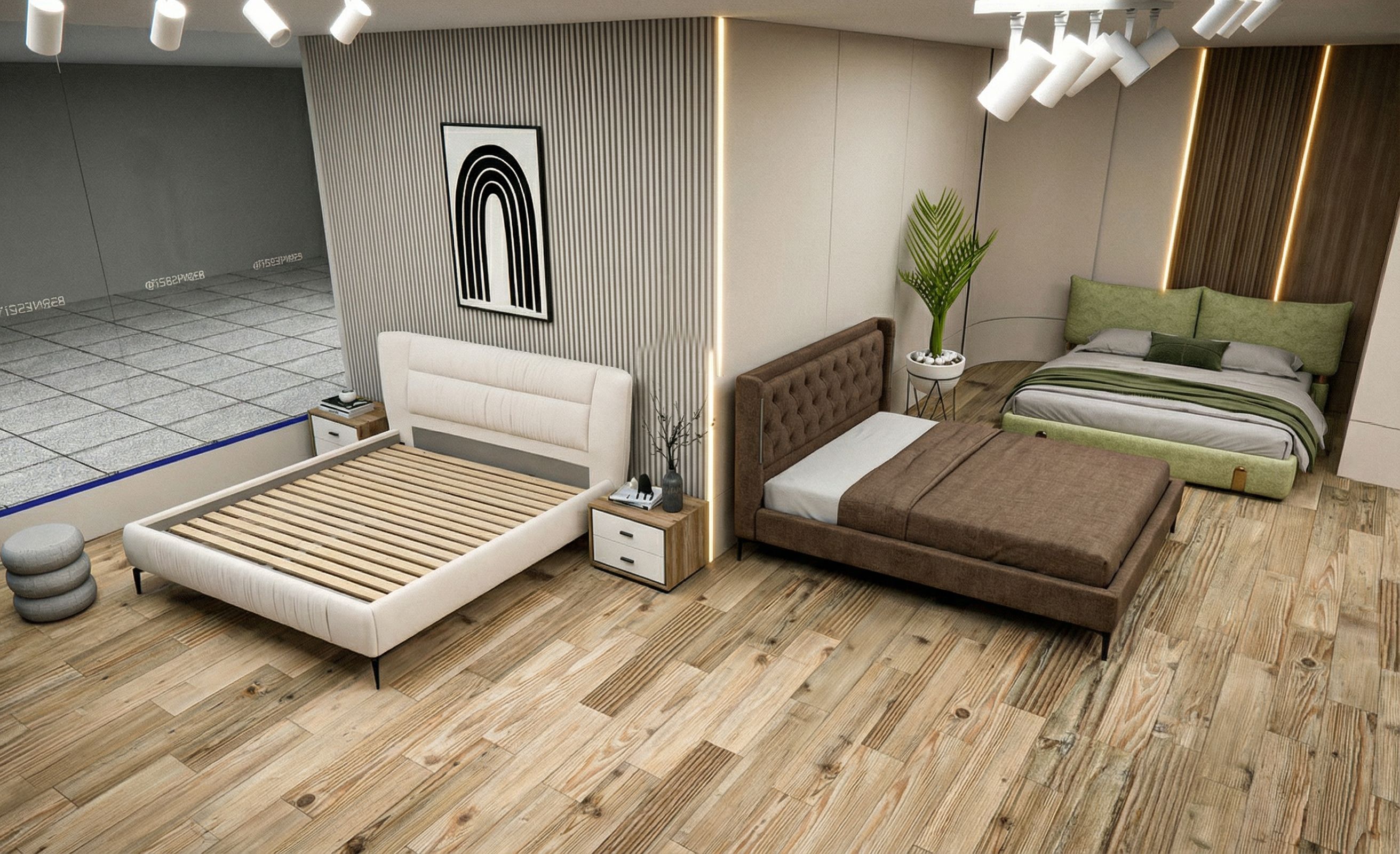Please draw a picture of the 3 pieces 180cm king size beds included in the reference section, along the panel wall, on the rendering image above. Place the first white bed to front of the stripped PVC panel wall. Brown bed is placed front of the beige plain wall, and green bed is placed front of the curved, wooden PVC panel with led lightened wall. Do not change the base image's position, angle and design Just add 3 beds. No other changes
