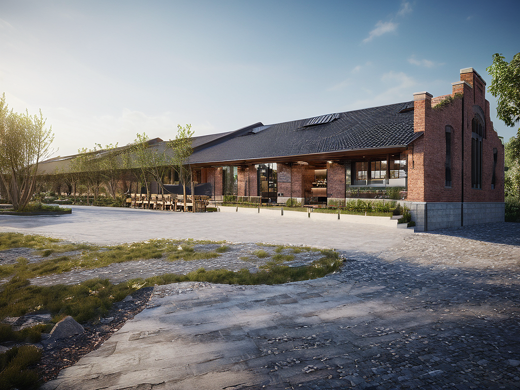 Promptrespect the materials of the construction, add a bar terrace with chairs and tables, add people