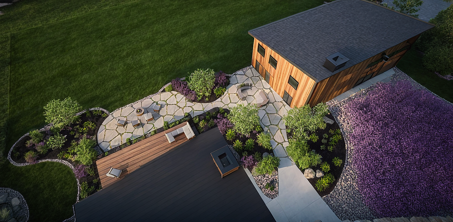 Promptlandscaping, teak siding, lawn, flagstone patio, mulch, concrete driveway, lawn furniture, junipers, river birch, lilac