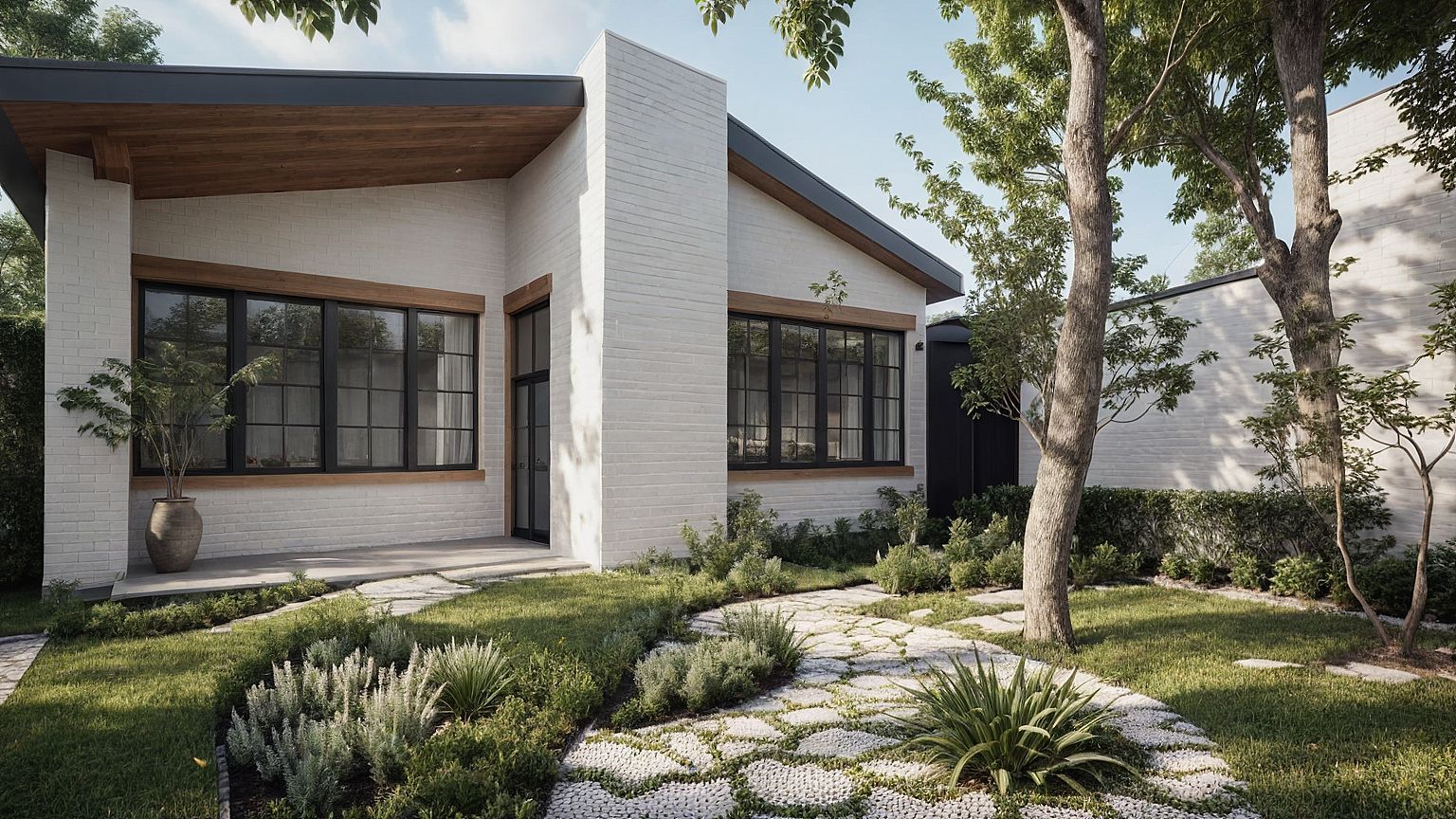 Promptthis is the facade of a medical office and architecture studio. the facade is made of exposed white bricks, the house is old, warm, and has a beautiful and lovely garden.