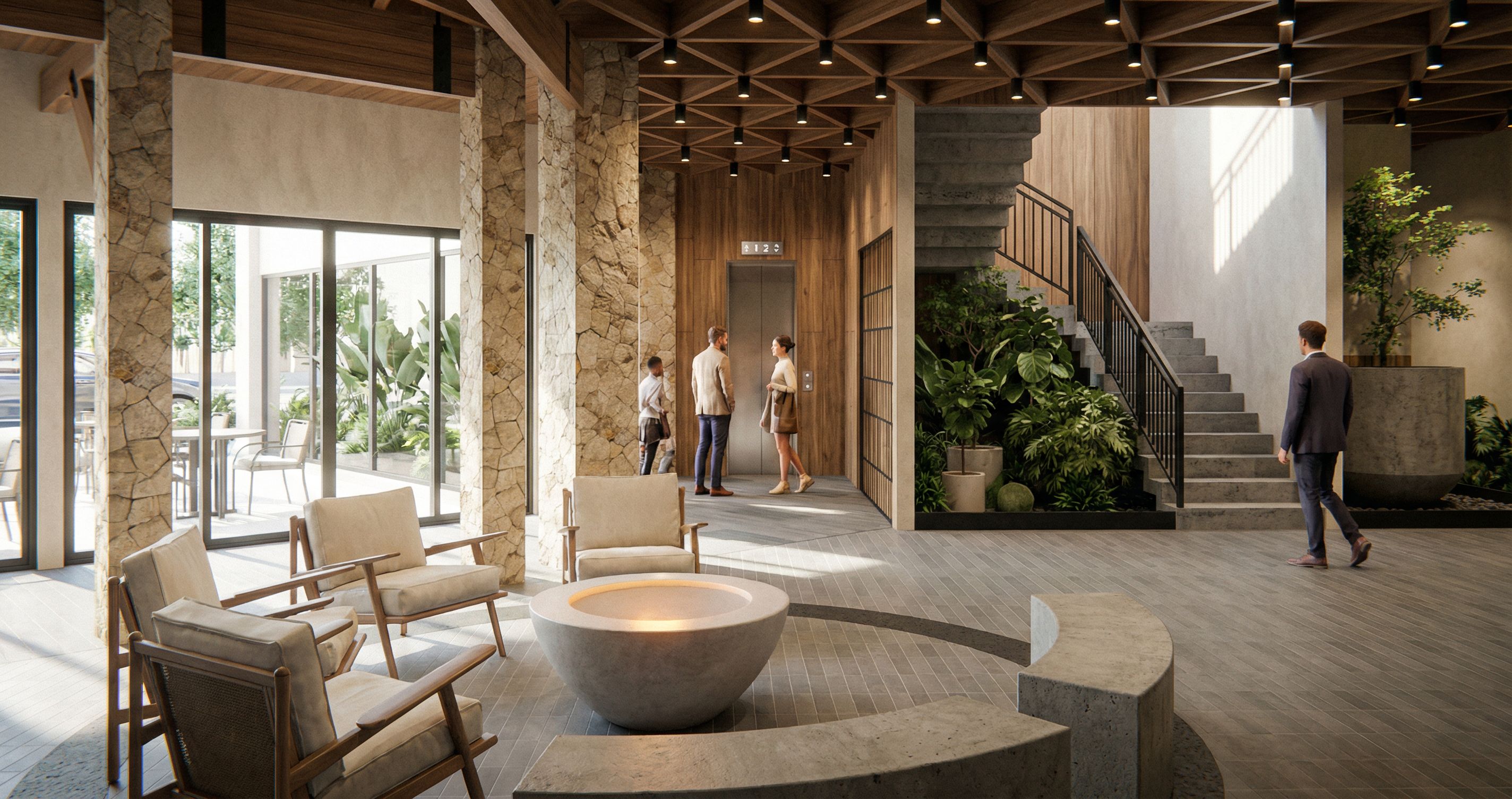 PromptHigh-end photorealistic boutique hotel motor lobby, warm and sophisticated arrival experience. Gray 7x30 cm tile floor and granite-style stairs, natural matte walnut wood ceiling in grid layout with 10 cm black tubular lights at intersections, soft warm hospitality lighting. Local San Cristóbal flagstone columns, matte black metal railings and hardware. Aged concrete plants for modern square, curated green area beside stairs. Low-profile aged concrete fire pit with subtle glow. Natural matte walnut wood wall paneling. Cinematic lighting, global illumination, realistic materials, soft shadows, ambient occlusion, wide-angle architectural lens, eye-level, ultra-high resolution.show the entire area of the uploaded image , keep exact camera angle