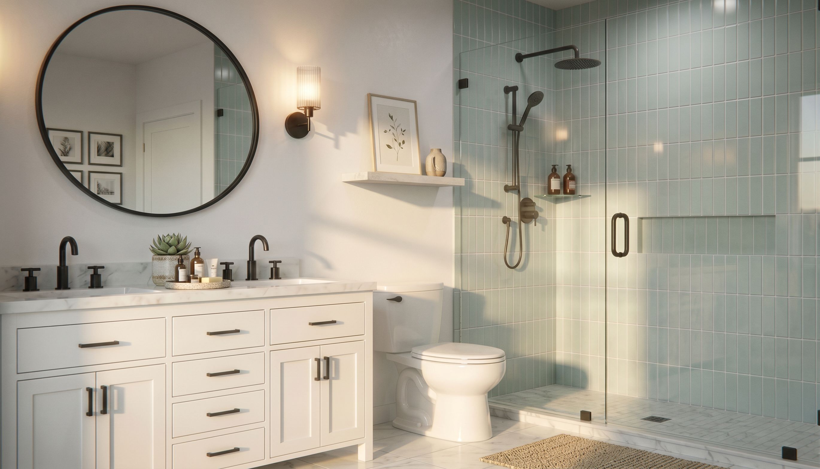 Promptwhite paint behind the sink wall, no bench in shower, minimal decor, keep exact camera angle