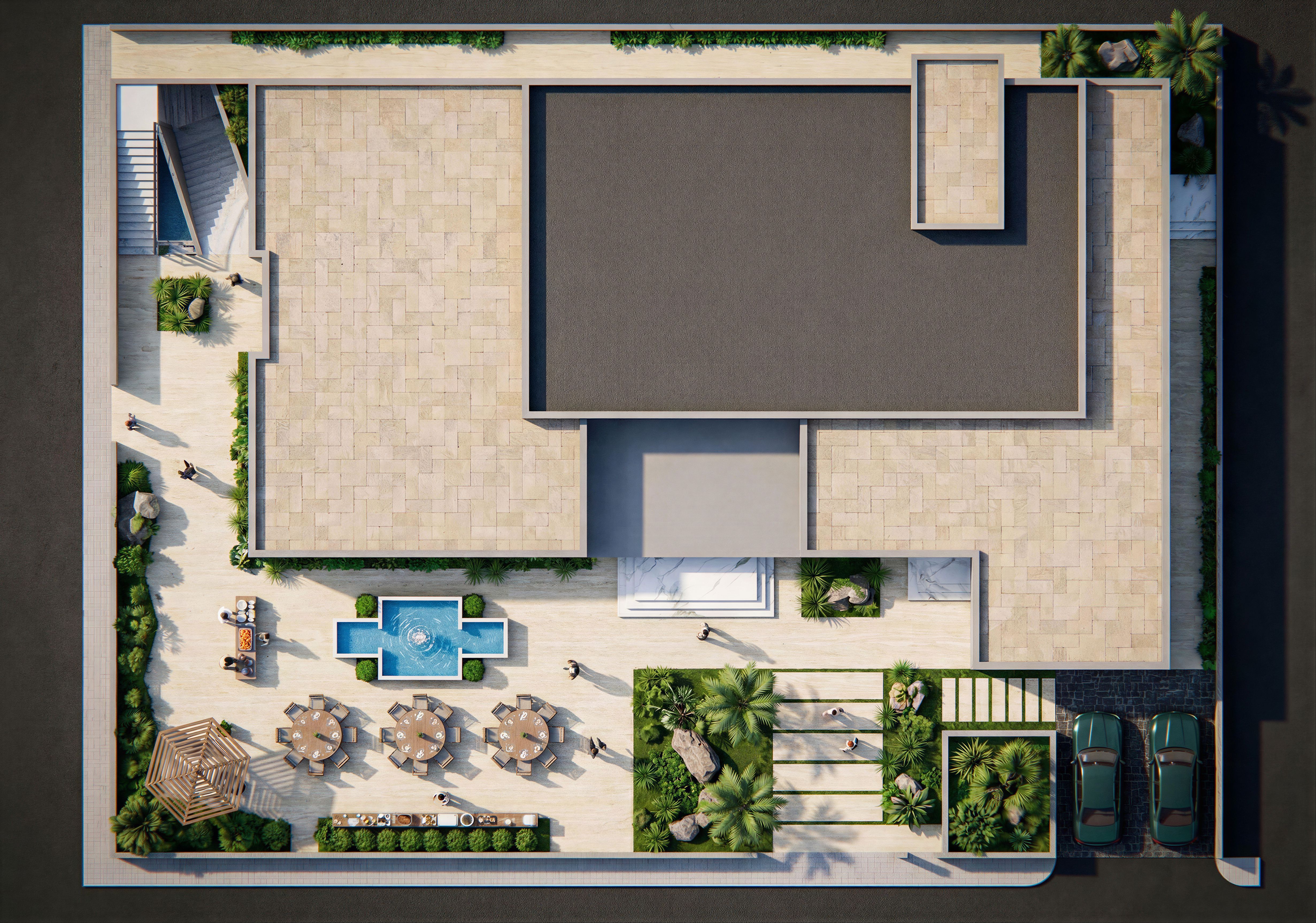 الصورة لفيلا سكنية فاخرة والرسم ملون بدرجات من اللون الرمادي ليساعد في تخيل مستويات الفيلا حيث ان الرمادي الغامق يمثل الجزء المرتفع و اللون الأفتح يمثل الاجزاء المنخفضة للمبنى فاجعل تكسية اسطح المبنى بلون بيج مراعيا فرق المستويات وكما يوجد في الزاوية اليسرى السفلية توجد مظلة بشكل سداسي وهي براجولا خشبية مع طاولات طعام بجوار النافورة و اما الجزء المستطيل المرسوم يسار النافورة باللون الاصفر يمثل بوفيه طعام مفتوح , و الدرج في الزاوية اليسرى العليا من الرسم يمثل درج ينزل الى القبو والمطلوب تقديم صورة واقعية لمواد الاكساء المناسبة بواقعية مع ظلال خفيفة لا تحجب ما تحتها علما انني اريد البازلت فقط في منطقة الكراج تحت السيارتين مع اكساء باقي الارضيات بالترافرتين مع الالتزام بالخطوط العامة للتصميم وبدون تغيير شكل النافورة ودون اضافة مناطق خضراء خارج الاسوار ولا تضيف للمبنى اي كتل اضافية وبدون اي مظلات خشبية باستثناء المظلة الخشبية في الزاوية مع عمل ادراج المداخل لمبنى الفيلا بالرخام الابيض الكلكتا وبدون تغيير شكل مبنى الفيلا وبدون اضافة اي قرميد لسطح الفيلا والتزم بحدود المناطق الخضراء في المخطط المرفق ودون اضافة حديقة في الزاوية اليمنى العليا لان هذه الزاوية جزء من المبنى ودون اي تغيير في شكل المبنى دون تقديم صورة منظورية ولكن فقط مسقط علوي