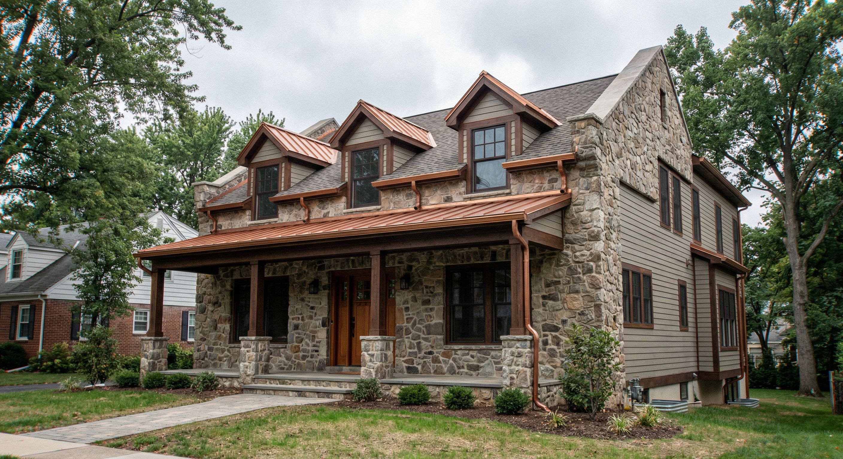 PromptKeep to original sketch. Render this house with stone front facade. Sloping stone parapet walls. No chimney. Contemporary siding on side walls. Copper metal roof accents. Copper gutters and downspouts. Wood trim accents. Inviting large front porch. Set in suburban neighborhood.