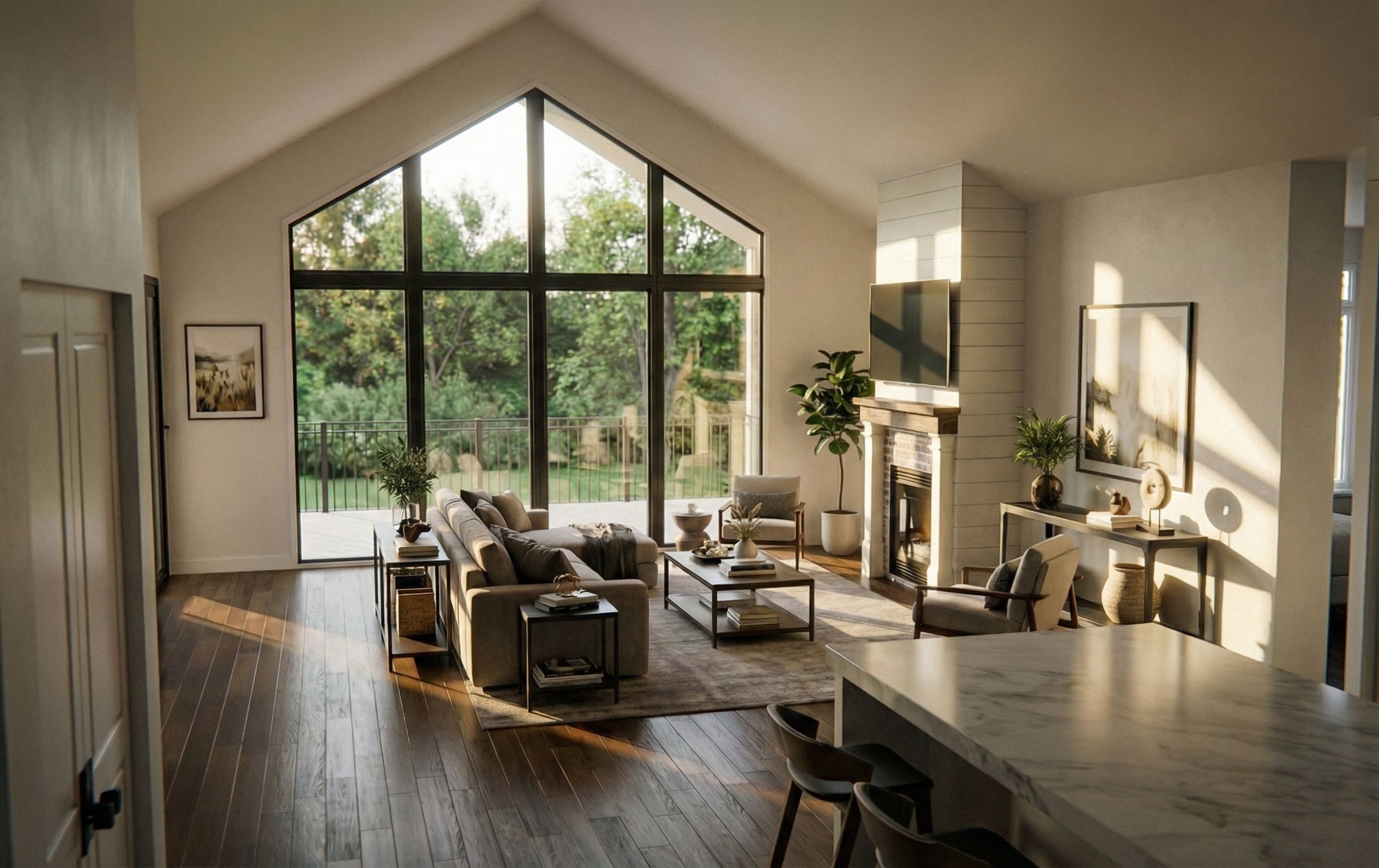 Photo of a modern living space featuring expansive floor-to-ceiling black windows, showcasing a view of the outdoors with trees and greenery. Emphasize the rich wooden flooring, sleek marble countertop, and a contemporary fireplace with a barn beam mantle and shiplap. The open layout flows naturally, highlighting the high vaulted ceiling. Soft, natural light streams in during late afternoon, casting gentle shadows across the room. Capture a low-angle perspective to enhance depth, focusing on the inviting ambiance and warm materials, creating a cozy yet sophisticated atmosphere. Show cozy furniture, a tv above the fireplace, , keep exact camera angle