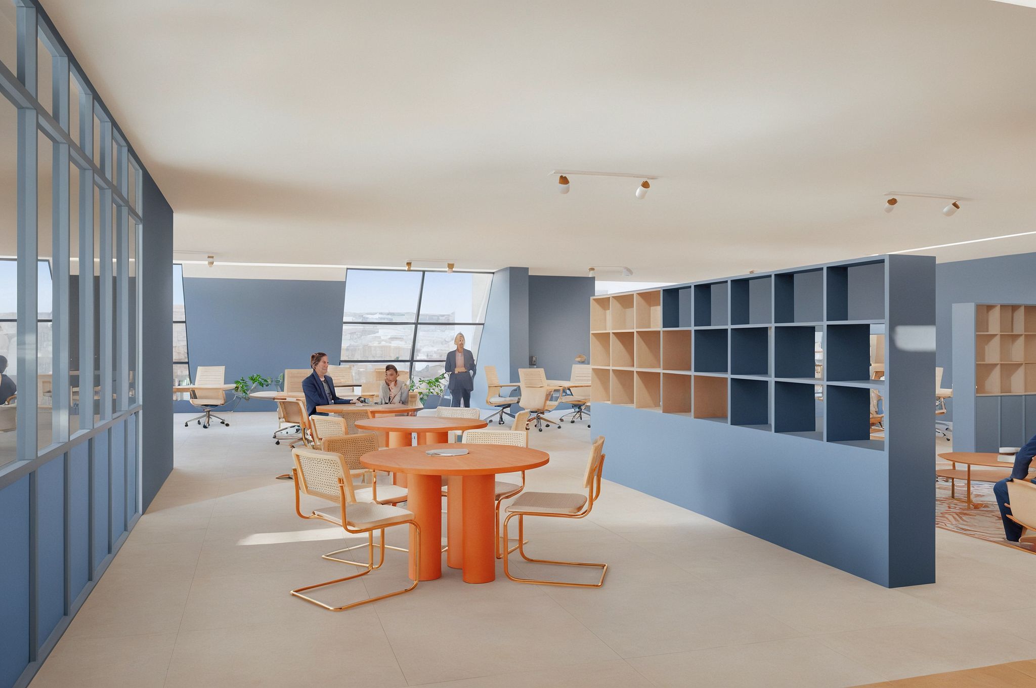Photo of a modern office interior, featuring open workspaces and collaborative areas. Emphasize vibrant blue walls complemented by striking red elements. Include large windows for natural light, casting soft shadows across the polished concrete floor. Highlight the unique design of round wooden tables paired with stylish chairs, creating an inviting atmosphere. Capture the angle from a corner of the room, showcasing distant seating areas and adjustable lighting fixtures that add a touch of dynamism to the space.