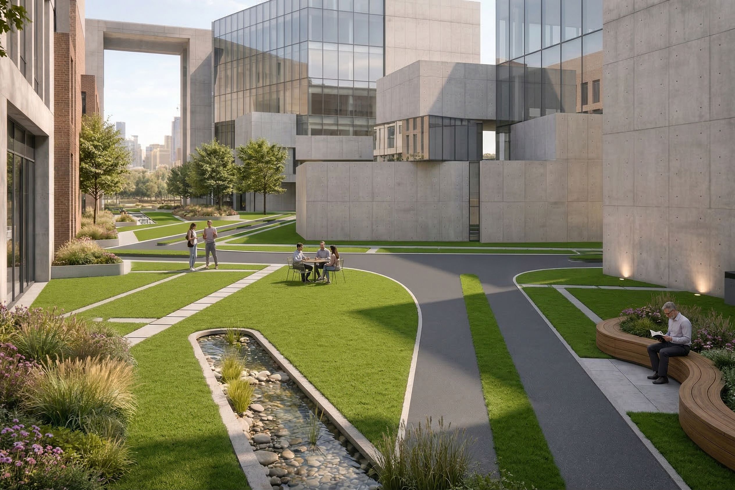 Photo of a center area of enjoyment on a urban planning sote. the buildings surrounding feel cohesive and welcoming whole tje outdoor spaces is a plaza where people chat amd unwind. it has shades and sum too. The materials used are glass, concrete and a little of terracota brick for the architecture. the geometry is left intact, but there is addition of furniture and landscape creating confortable and intentional outdoor spaces for the public to enjoy . Use the reference picture just for materially and lighting