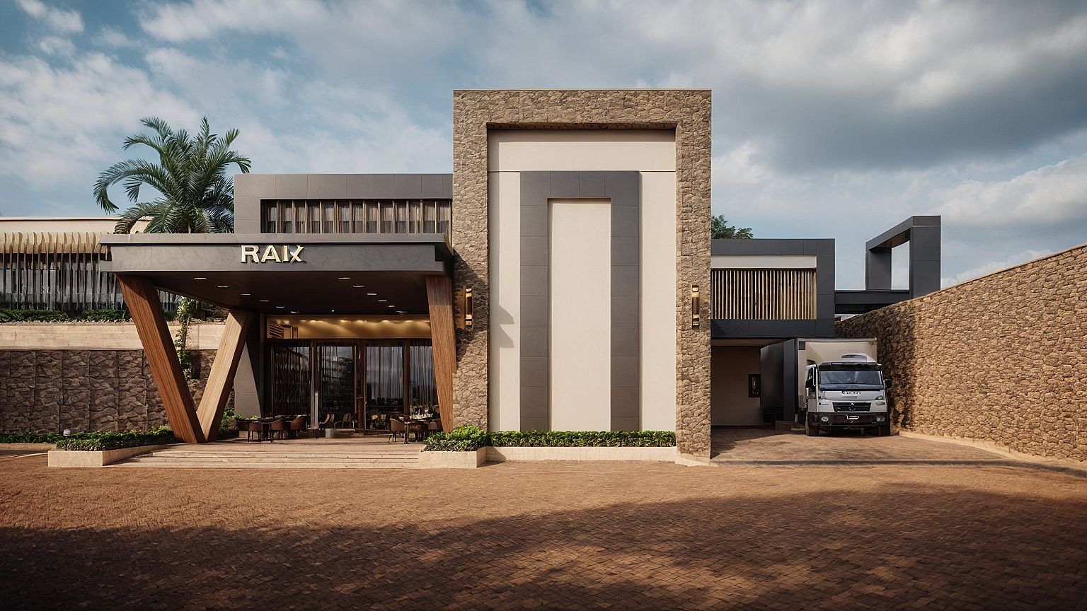 create a high-end image, very tidy around of this new hotel in Kampala context. maintain the image angle. place some people in the context