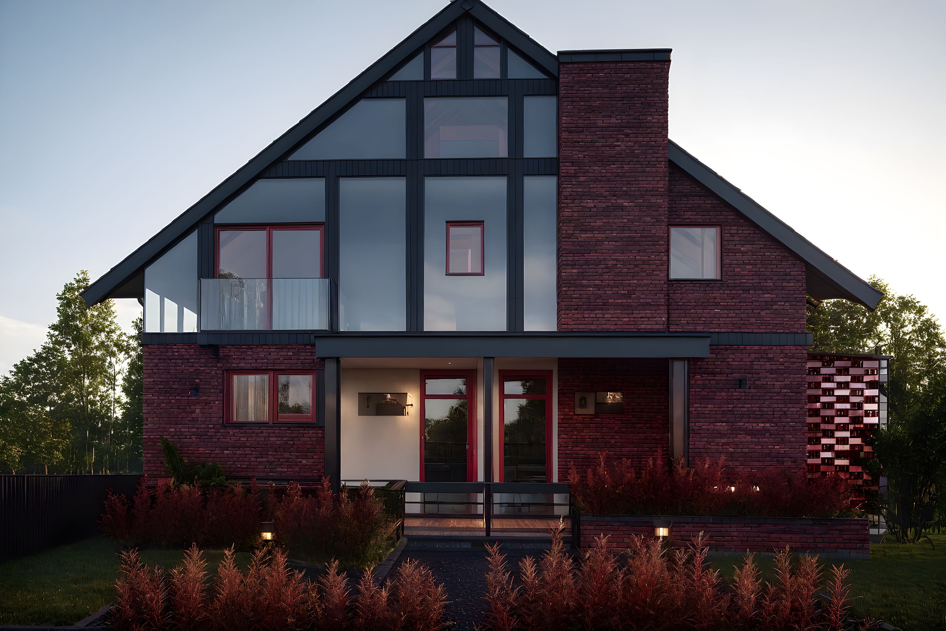 PromptIt is the facade of a German country-style house. The materials used are bricks in red tones, dark woods, glass, iron railings on the balcony. The principal doors are dark brown.