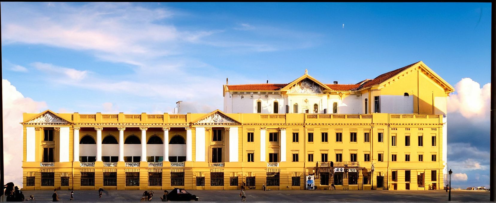 Prompthistoric building of neoclassic style. A setbacked balcony with tall windows behind the columns of the second floor. blue sky with couds.