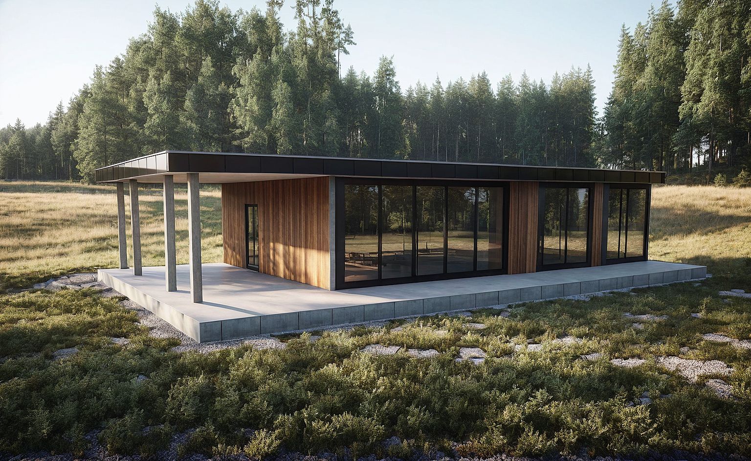 PromptModern minimalist house, concrete, wood paneling, glass windows, concrete porch, straight lines, geometric shapes, it is surrounded by a forest. bright daylight.
