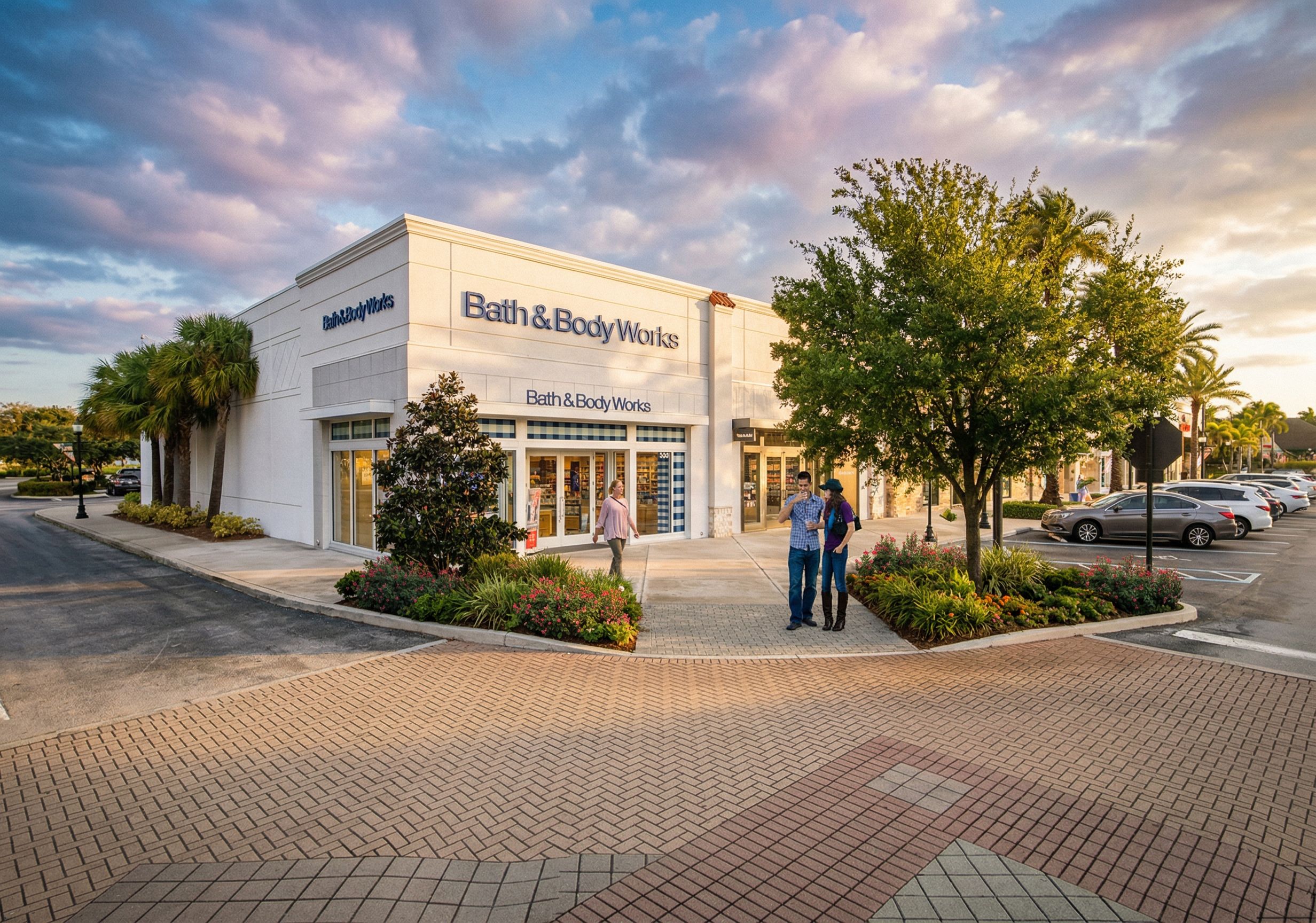 PromptPhoto of a modern retail building featuring a sleek facade with white stucco, large glass storefronts, and blue signage. Surrounding the structure are well-maintained gardens with colorful flowers and palm trees, nestling it within an inviting urban landscape. The scene is bathed in soft, diffused sunlight, highlighting the textures of both the architecture and flora. Captured from a low angle with a wide lens, the image frames the building prominently against a partly cloudy sky, emphasizing its contemporary design and the bustling environment., keep exact camera angle