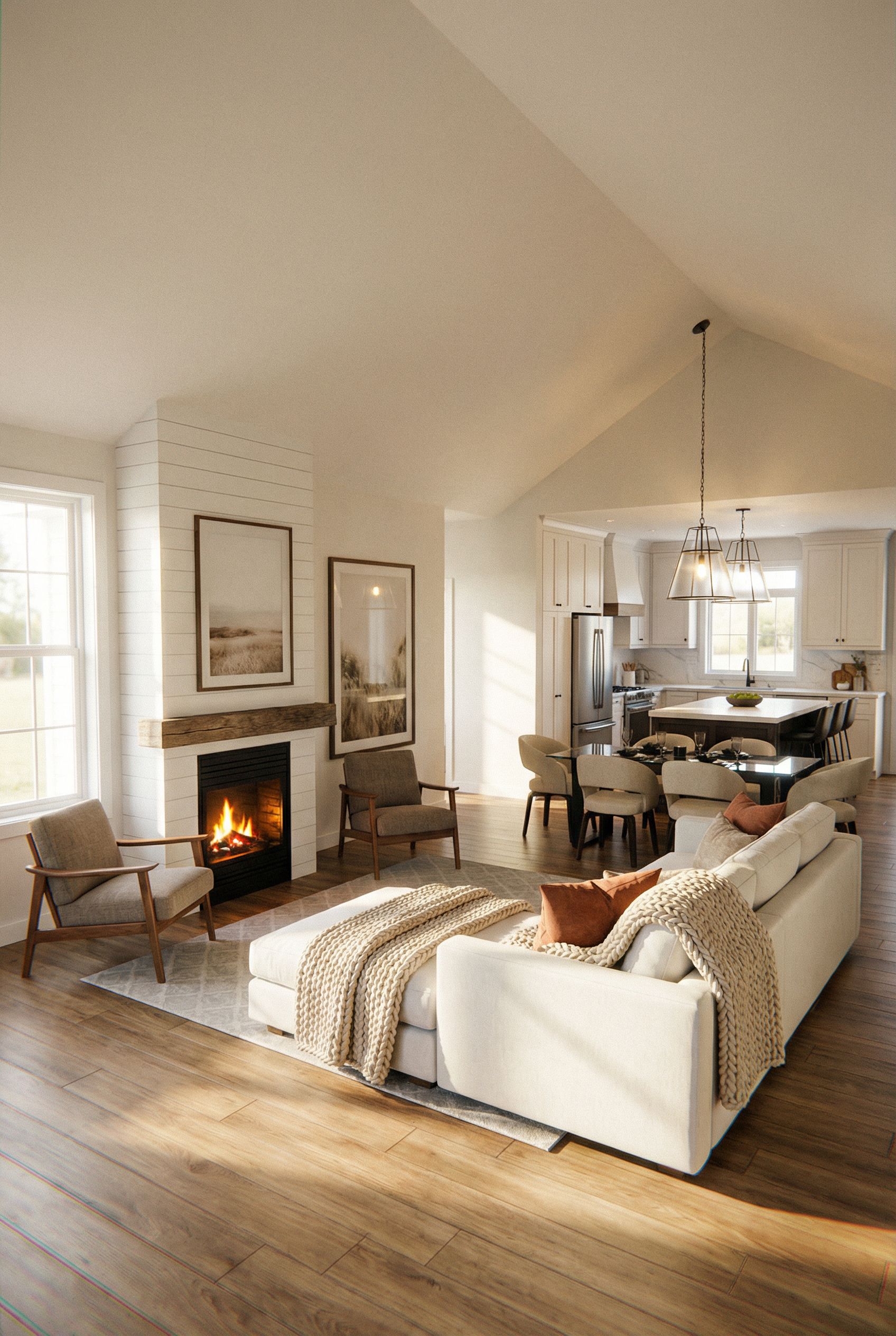 PromptWhite side window, smaller shiplap fire place with a barn beam mantle, white couch with terracotta pillows and throw blanket, two wood frame arm chairs on either side of the fireplace, large art work behind the couch, pendant lights over the island like reference photo 2, keep exact camera angle