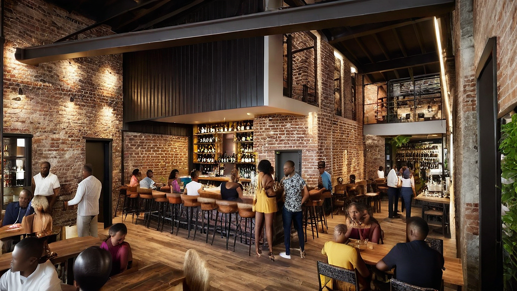PromptInterior seating area with a bar for Jamaican fine dining restaurant, showcasing Jamaican tropical style with exposed weathered brick on existing wall, wooden and metal frames, light wood flooring, and tropical light style. the furniture is modern and colorful. Include a stained graphic and framed wine cellar on the wall. add some color accent on the new wall