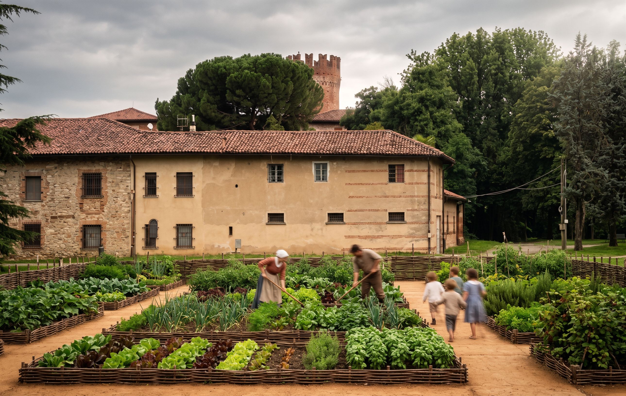 PromptInserisci a filo edificio storico in primo piano a poca distanza jatdin de poutagier di limitate dimensioni di tipo ottocentesco, senza casette o altre strutture I vialetti interni sono in terra stabilizzata Inserisci persone che si occupano del jardin e visitatori bambini