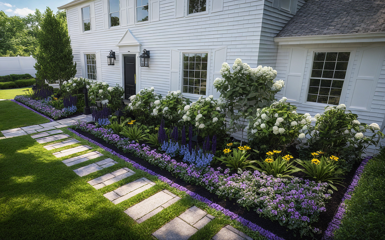 PromptEnhance, white house, lawn space, green boxwoods, white hydrangeas, purple salvia, black-eyed Susan, black mulch, blue phlox groundcover