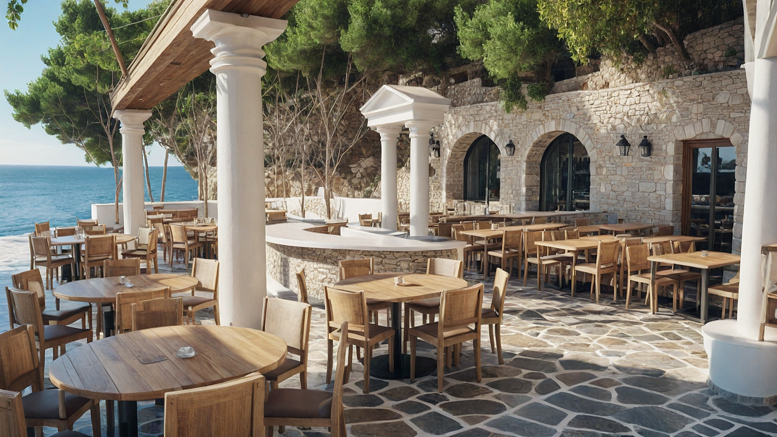 PromptExterior of a restaurant with creek style looking over the sea. the restaurant colors are Greek. Floors are stones