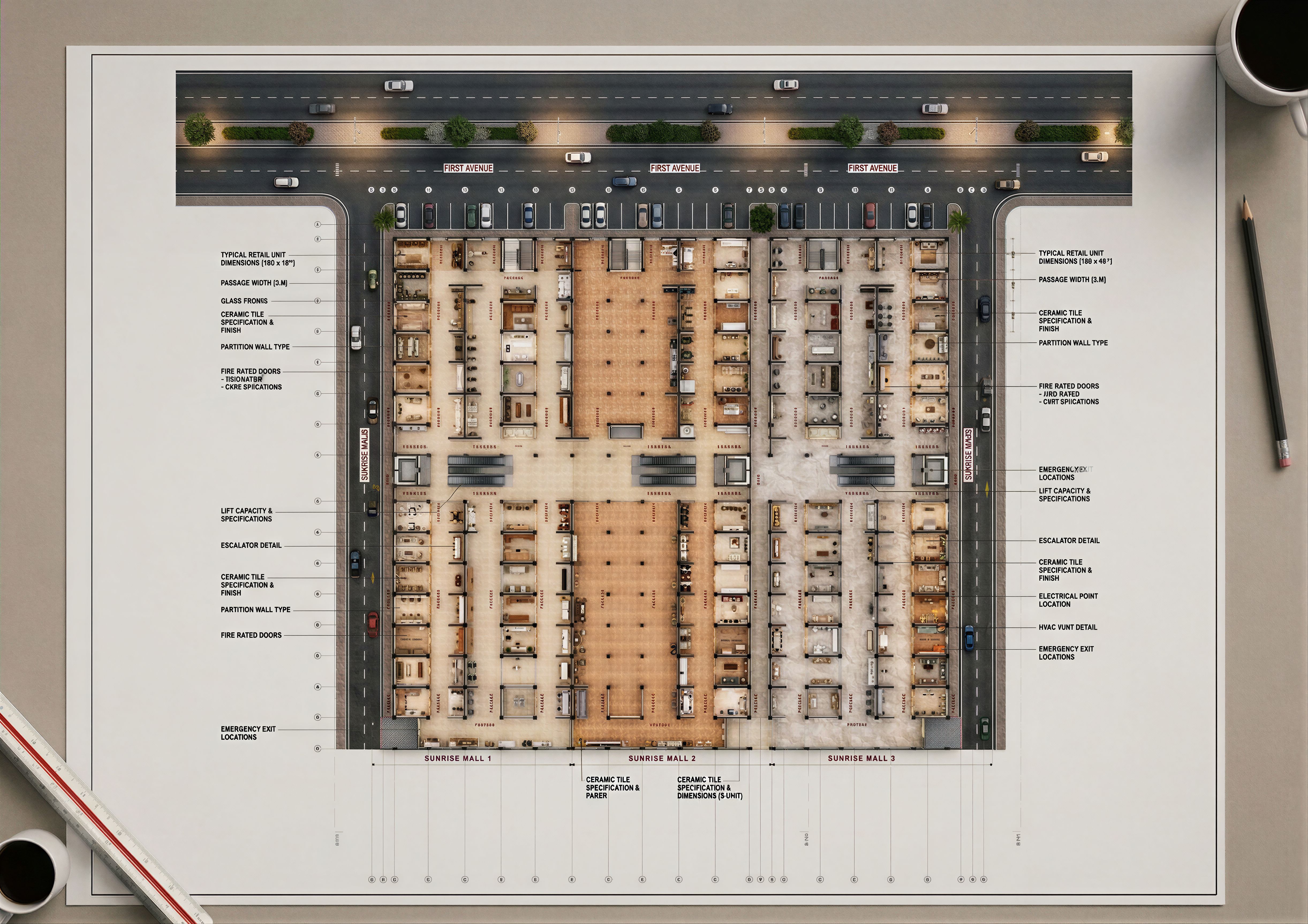 EnhancedPromptLAYOUT OF A SHOPPING MALL WITH SHOPS. CLEARLY INDICATE THE PARTITIONS, ACCESS ROADS, STAIRS AND ESCALATORS AND ELEVATORS. MAINTAIN ORIGINAL LAYOUT DESIGN AND ANNOTATIONS. USE CERAMIC TILES ON THE FLOOR.MAKE IMAGE REALISTIC HIGH RESOLUTION 8K. MAINTAIN ORIGINAL LAYOUT WITH PARTITIONS. MAKE LAYOUT REALISTIC AND HIGH RESOLUTION. MAINATIN ORIGINAL ANNOTATIONS. MAINTAIN ORIGINAL UPLOADED LAYOUT. PL;EASE MAINTAIN ORIGINAL LAYOUT ,ANNOTATIONS AND PARTITIONS. MAKE LAYOUT REALISTIC., keep exact camera angle