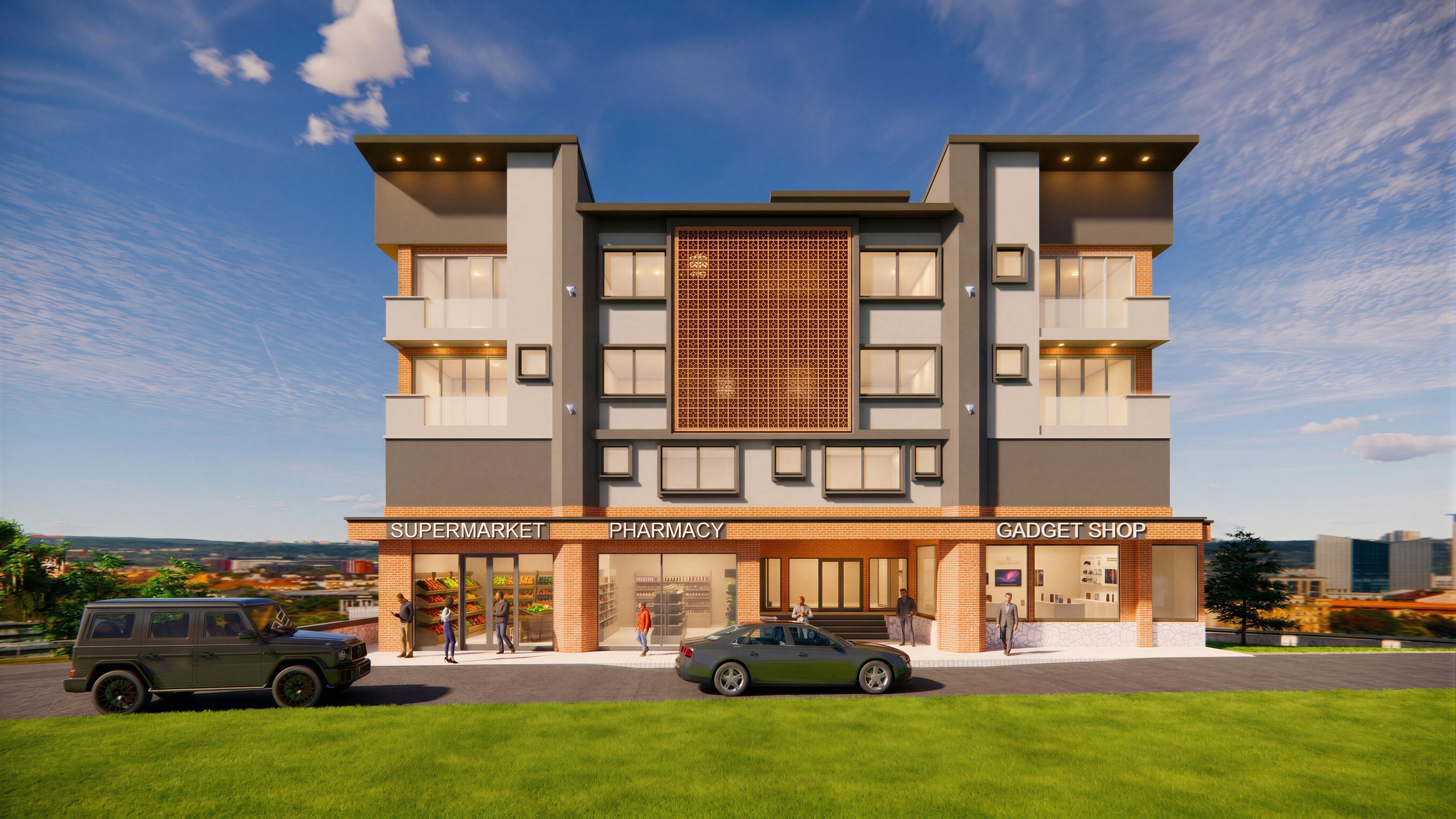 EnhancedPromptthis is a mixed use building with shops on the ground floor as indicated with the labels. the upper floors are apartment floors. add some subtle warm lighting inside the shops to show what's inside the shops through the glass of the shops. add some subtle warm light inside the apartment units such that's its subtly visible through the apartment windows and glass doors. do not change any materials or colours on the building. do not add any objects or elements on the balconies of the apartment units. add some warm dimly lit LED spotlights above the balconies of the apartments. upscale the image resolution to 4k, keep exact camera angle