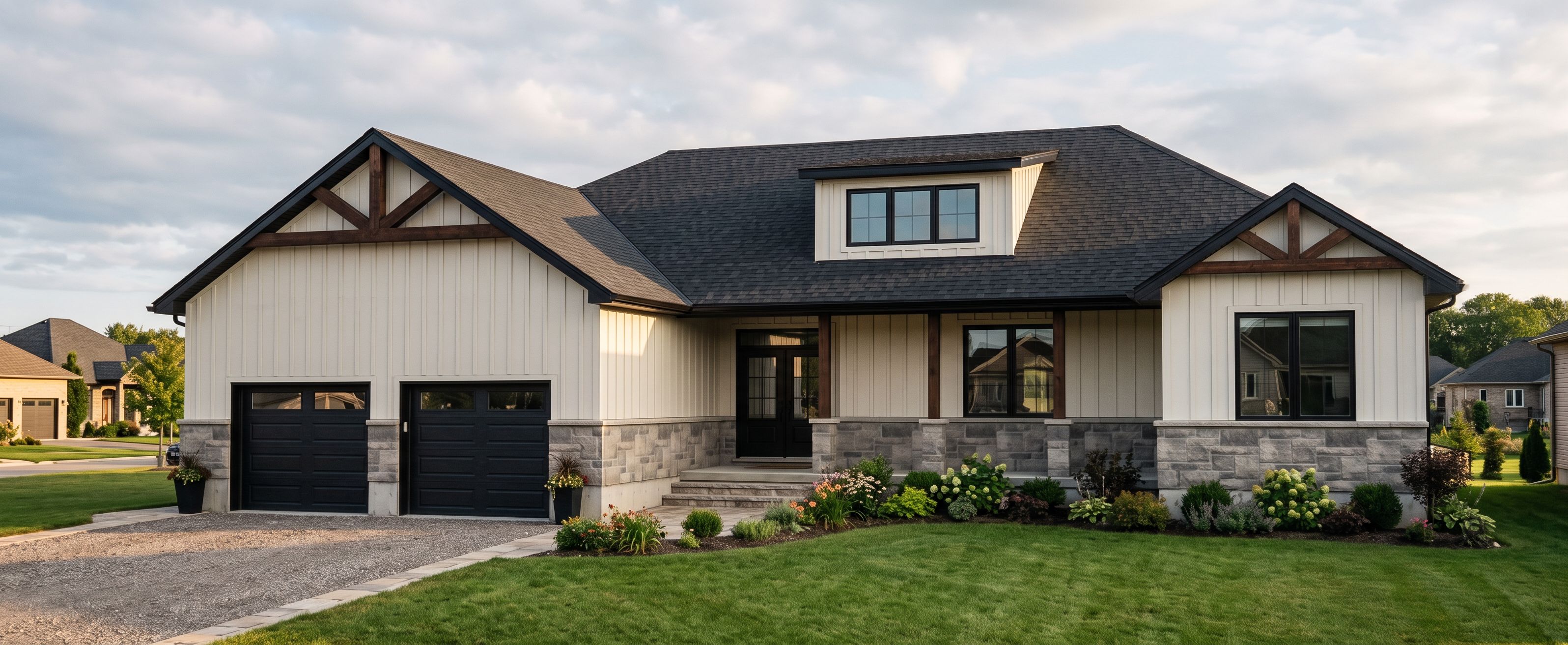 Photo of a contemporary residential house, featuring a blend of wooden and stone materials. Emphasize the gable roof design, prominent front steps leading to a stylish entrance, and large windows. The surrounding urban setting includes landscaped greenery and neighboring homes. Utilize golden hour lighting to create soft shadows, highlighting textures. Capture from a low angle to enhance the building's stature, using a wide-angle lens to encompass the front yard and adjacent structures., keep exact camera angle