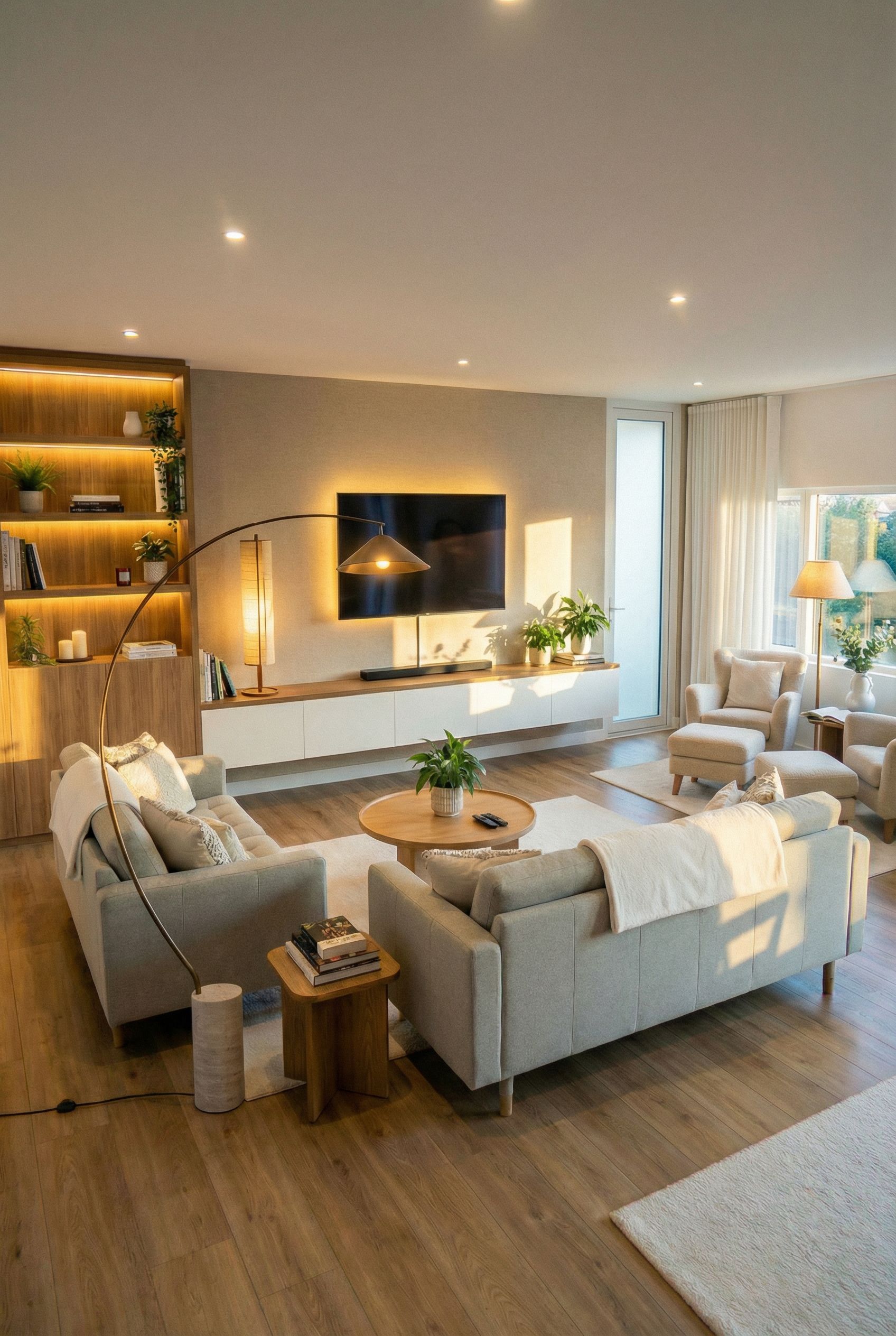 cambia de lugar la lampara grande de pie curvada, que este al lado de la pequeña mesa entre los sofás y que sea como la primera imagen de referencia. la lampara de encima del mueble de la televisión que sea como la segunda imagen de referencia pero que sea mas pequeña para que encaje con el lugar. la lampara de la zona de butacas que sea mas bonita como las otras dos. todas las lamparas tiene iluminación cálida. no cambies nada mas, ni la posición de los muebles ni la perspectiva ni decoración. únicamente cambia las lamparas que te he dicho.