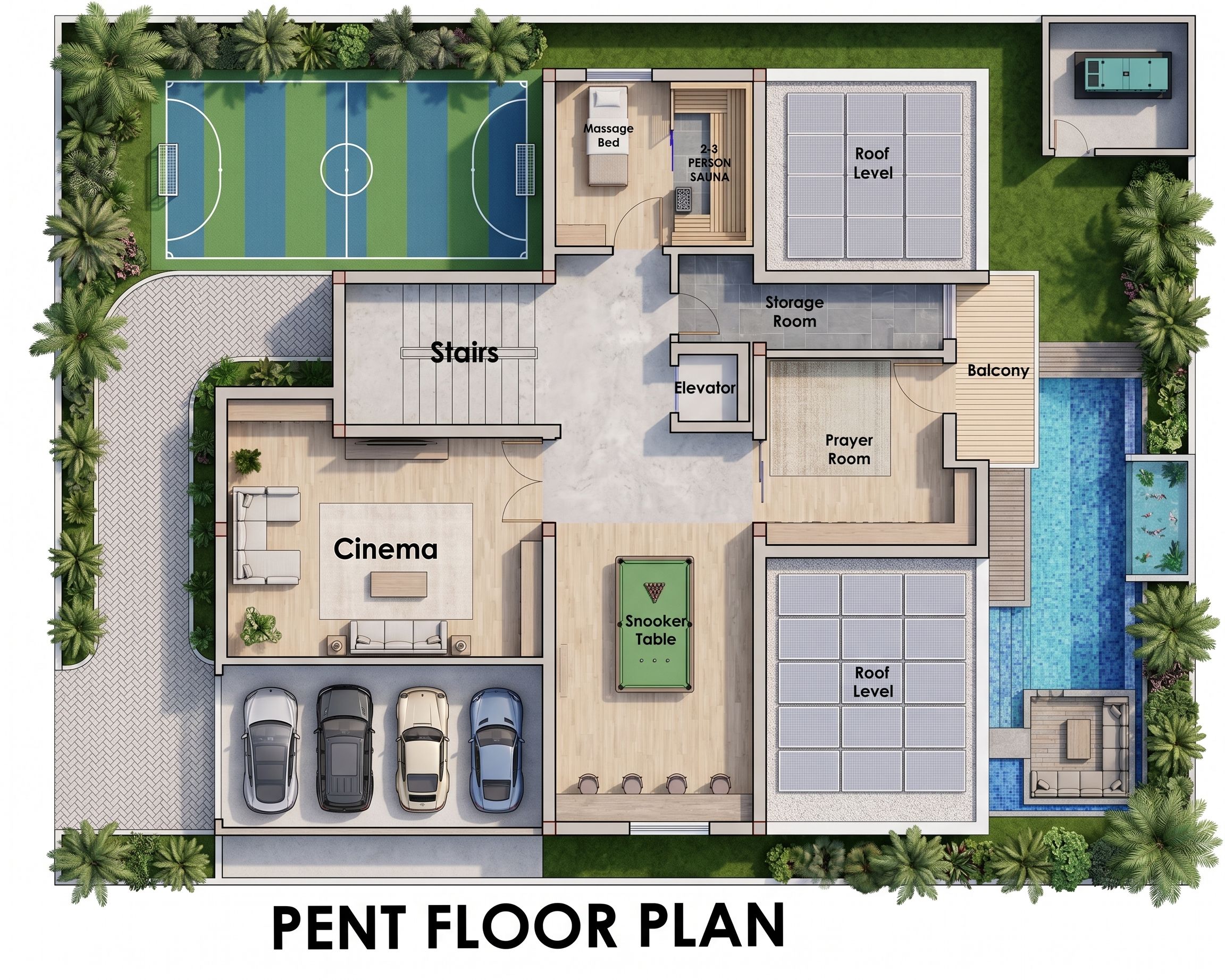 Create a photorealistic 2D rendered ground floor plan in top view, based on an architectural site layout. The design should clearly show a modern residential compound with labeled spaces and a clean presentation style. Include the following elements exactly and proportionally: Drive-in entrance with paving pattern Automated car garage with 4 parked cars Main building layout with clearly labeled rooms: living room, dining, dry kitchen, pantry, guest room, office, elevator, stairs, laundry Outdoor features: swimming pool with pool deck, sunken pool seating, outdoor aquarium Generator house positioned at the far end Green areas with palm trees and landscaping around the compound Futsal pitch / recreational space at the top section Style the plan with: Modern furniture layout top view Material differentiation tiles, concrete, greenery, water Soft shadows and realistic lighting effects Clean linework with subtle color coding Readable room labels and annotations Color palette: Neutral tones beige, grey, white for floors Green for landscape Blue tones for water features Light wood tones for furniture accents Presentation style: Architectural presentation board style High-end, clean, minimal, professional Balanced composition with white background No perspective distortion Quality: Ultra-detailed, sharp lines 4K / 8K resolution Realistic textures and shadows, keep exact camera angle