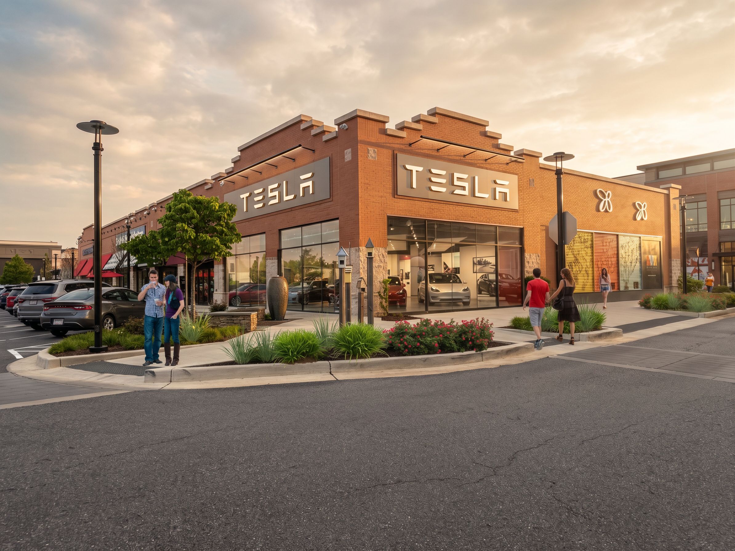 Photo of a modern retail building featuring a prominent Tesla storefront, emphasizing brick and glass materials, sleek lines, and dynamic shapes. Set in a vibrant urban shopping area, surrounded by lush landscaping and contemporary storefronts. Natural lighting during late afternoon creates soft shadows and highlights. Perspective captures an inviting street view with pedestrians interacting, framed by green plants and decorative elements, using a wide-angle lens to enhance depth and engagement., keep exact camera angle
