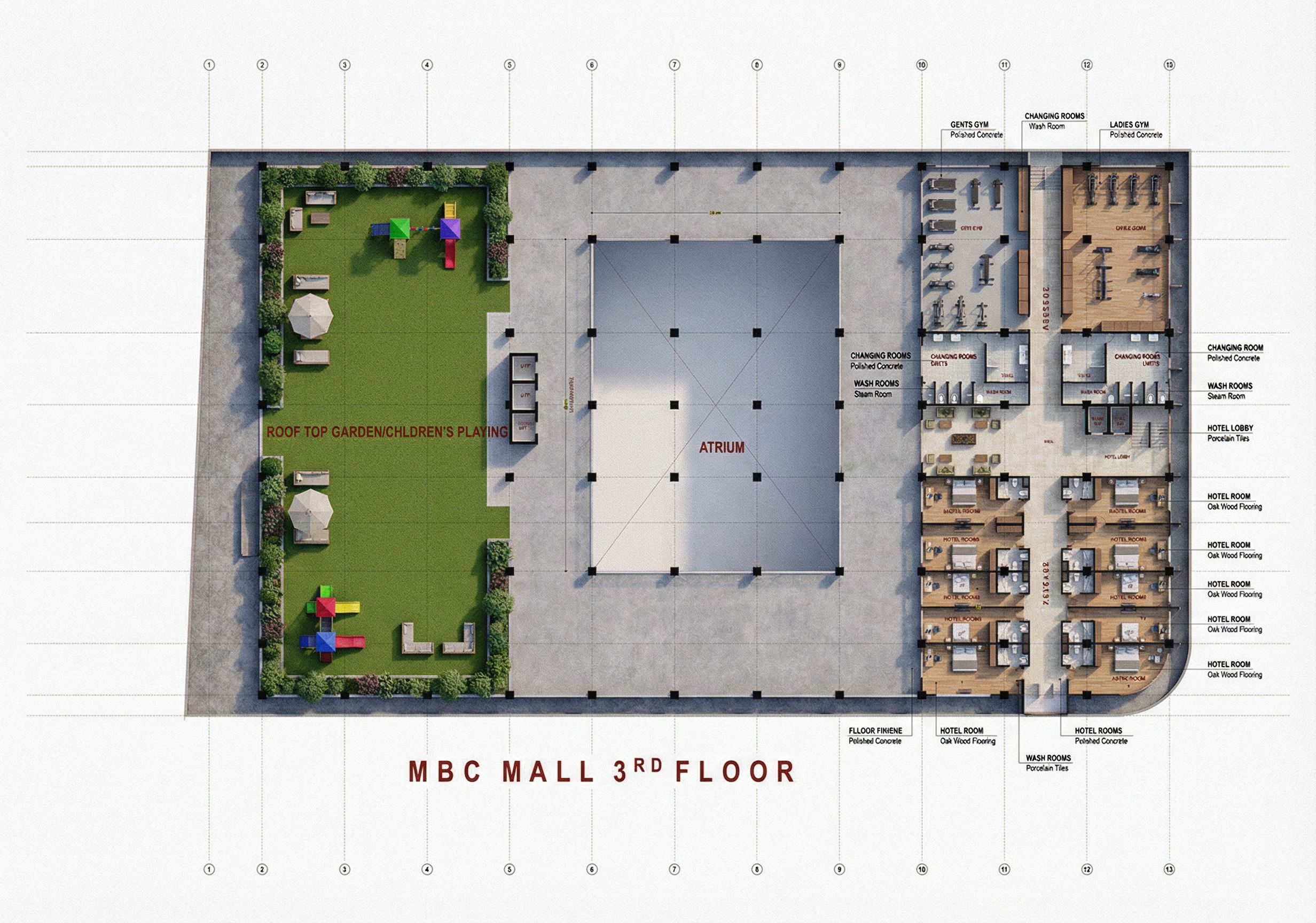 LAYOUT SHOWING LADIES AND GENTS GYMS , HEALTH CLUB WITH STEAM ROOM. CLEARLY SHOW THE WASH ROOMS. HOTEL ROOMS WITH FURNITURE. ROOF TOP SITTING AREA WITH CHILDREN PLAYING AREA AND OUTDOOR SITTING. MAKE LAYOUT REALISTIC AND MAINTAIN THE ORIGINAL LAYOUT., keep exact camera angle