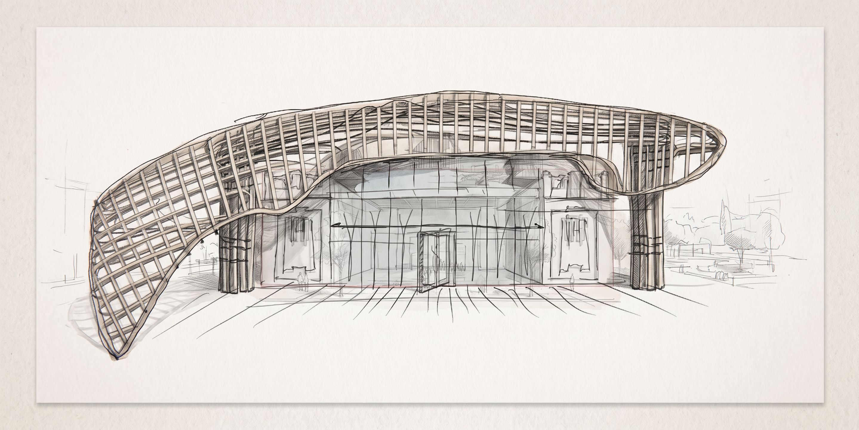 Promptmake the front fasade glass with the glass doors and make the woden roof looks natural with the buliding but dont change shape of anything, follow the shape of the roof and the colums will be nex to the building too, make it just like drawing sketch, keep exact camera angle
