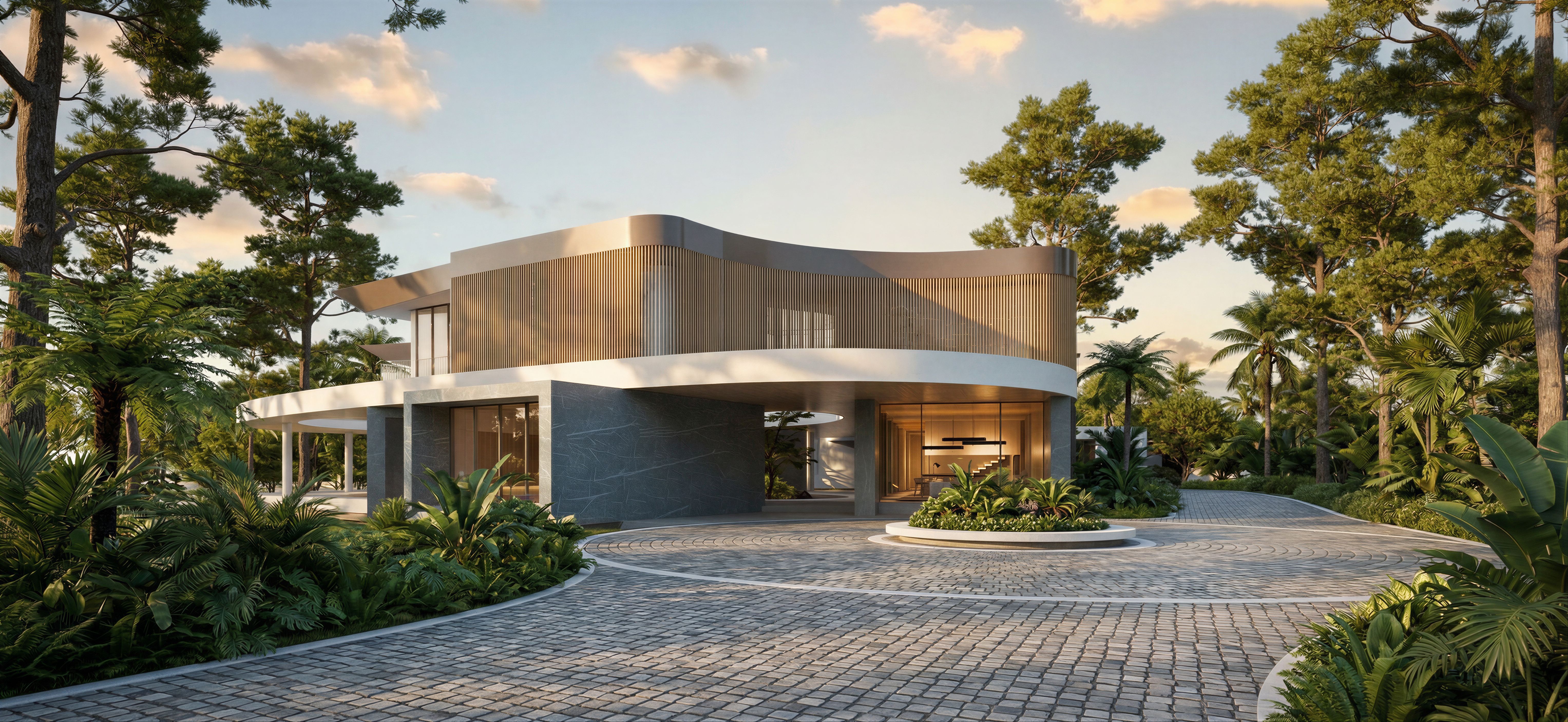 EnhancedPromptPhoto of an ultra minimal luxury villa , emphasizing sleek lines and a combination of wood and stone materials. The structure features large glass windows, vertical wooden slats, and a distinctive curved brownish gray metallic roof edge. Surrounded by tropical lush greenery, tall trees, and a smooth flat cobbled stone driveway, with no cars in the image. Afternoon sunlight casts soft shadows, highlighting the architectural details. Wide-angle perspective captures both the building and its inviting entryway, enhancing its elegance and integration with the natural environment., keep exact camera angle