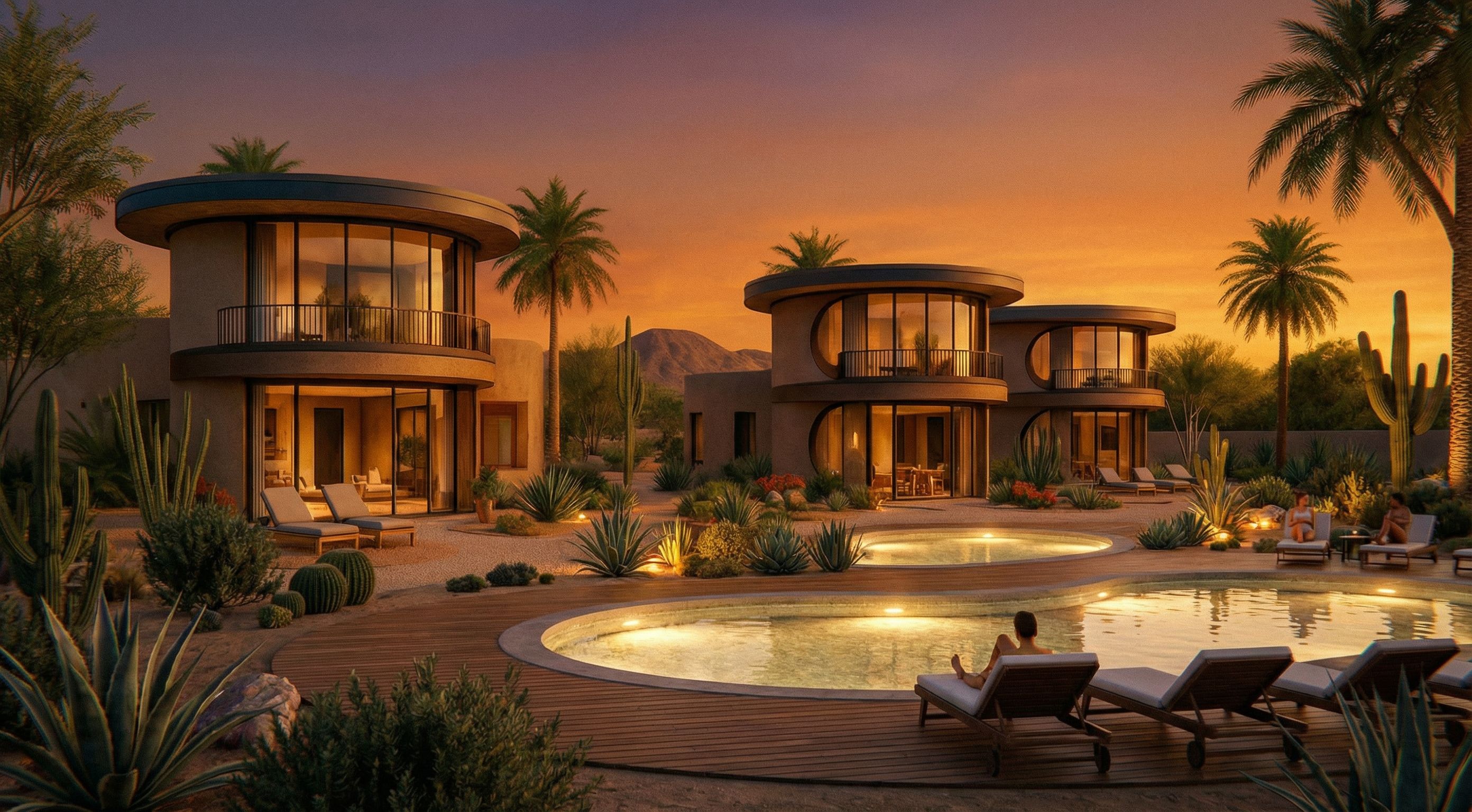 PromptLeave rendering exactly the same except add lighting to pool water and landscaping