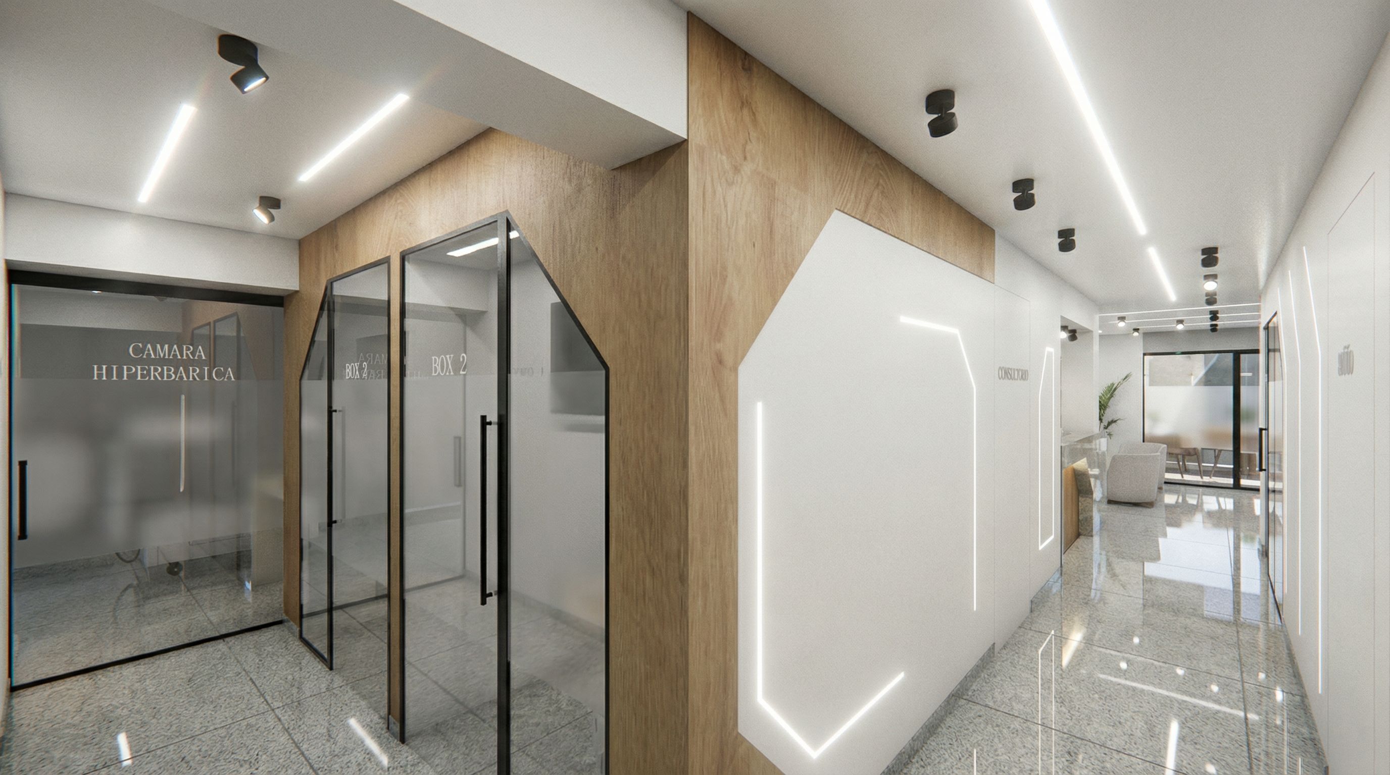 PORFAVOR AÑADE EL EFECTO DE LA ILUMINACION, DEBE SER BLANCA PORQUE ES UNA CLINICA, EL PISO ES GRANITO COLOR GRIS CLARO POR LO QUE SE DEBE NOTAR EL BRILLO, NO PUEDES CAMBIAR EL TONO DE LA MADERA, keep exact camera angle