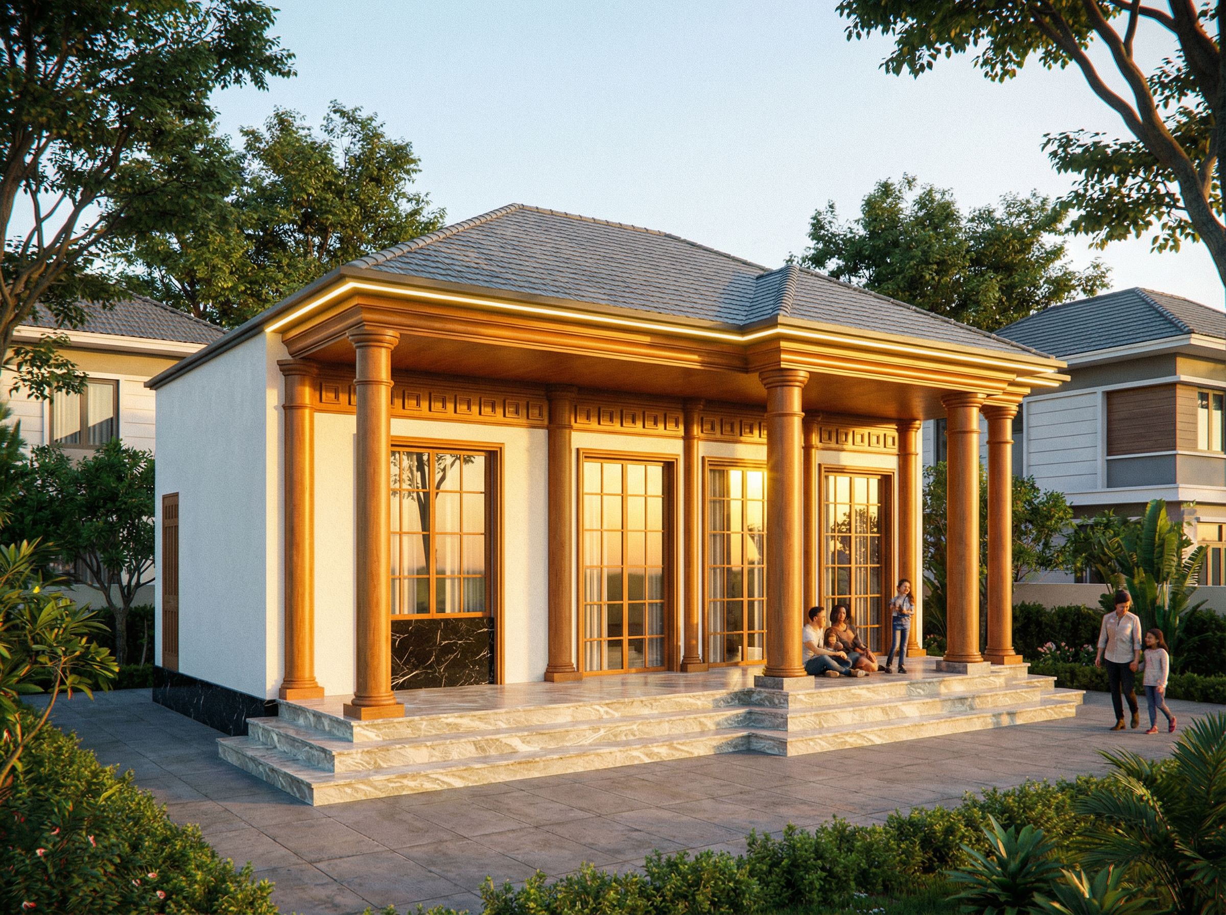 The photograph depicts a classic single-story house with wooden columns and a sloping gray tiled roof. The wooden frame is simply decorated with square elements, and the windows feature large wooden panels with glass panes. Surrounded by a minimalist setting, the house stands out with black stone accents at the base of the walls. The steps are paved with cream-gray marble with veins, and LED lighting is installed under the roof. The house is bordered on both sides by neighboring properties. It is illuminated by soft natural light, highlighting the texture of the materials. Maintaining the original design angle, the camera focuses on the entrance, main hall, and the entire house. A wide-angle lens is used to capture the entire facade, creating a vibrant image that emphasizes depth and detail. The entire architectural form and lines of the uploaded image are preserved.