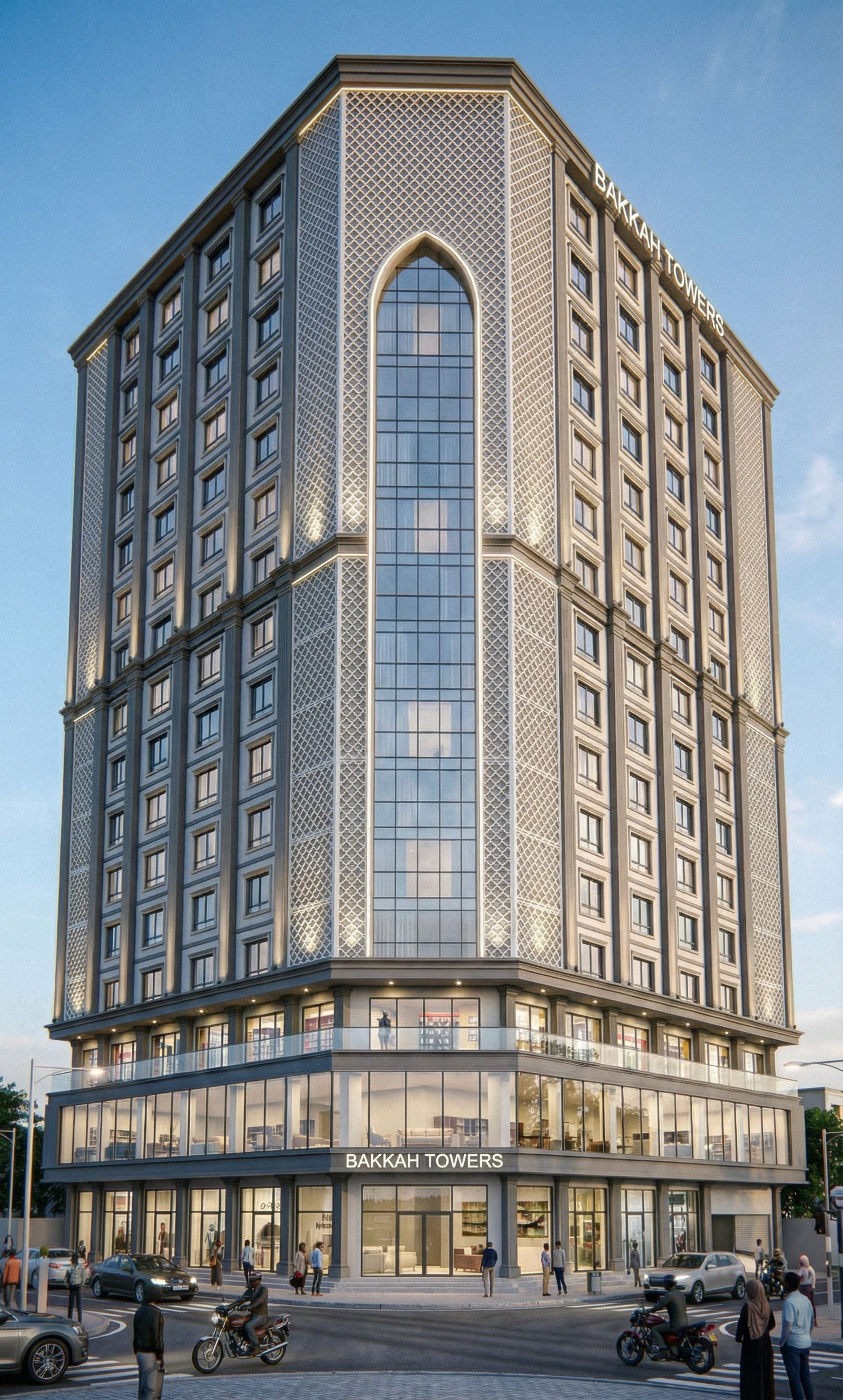 MAKE GLASS CLEAR, REFLECTIVE AND REALISTIC. USE THE COMBINATION OF COLOURS IN THE REFERENCE IMAGE. WRITE NAME"BAKKAH TOWERS" AT THE TOP CORNER JUST ABOVE THE ARCH. MAINTAIN NUMBER OF LEVELS OF BUILDING AND CAMERA ANGLE. INTRODUCE CURTAIN WALLING BEHIND THE LATTICE WORK. RENDER OF A BUILDING IN EASTLEIGH AREA IN NAIROBI DURING THE DAY. TWENTY STORIED BUILDING WITH GROUND FLOOR AS COMMERCIAL, FIRST FLOOR FURNITURE SHOP WITH CLEAR GLASS AND SECOND FLOOR SHOPS WITH GLASS BALCONY. THE REST OF THE FLOORS APARTMENTS. SHOW THE WHOLE BUILDING TO THE TOP AND INTRODUCE CURTAIN WALLING BEHIND THE MASHRYABIYA. USE COMBINATION OF A LIGHT PASTEL GREY AND WHITE ON THE BUILDING. INTRODUCE ROPE LIGHTS , STREET LIGHTS AND SPOT LIGHTS IN THE BUILDING. MAINATIN DESIGN OF ORIGINAL IMAGE, CHANGE COLOUR ONLY. USE SHADES OF BEIGE ON THE BUILDING. AMINTAIN CAMERA ANGLE,, keep exact camera angle