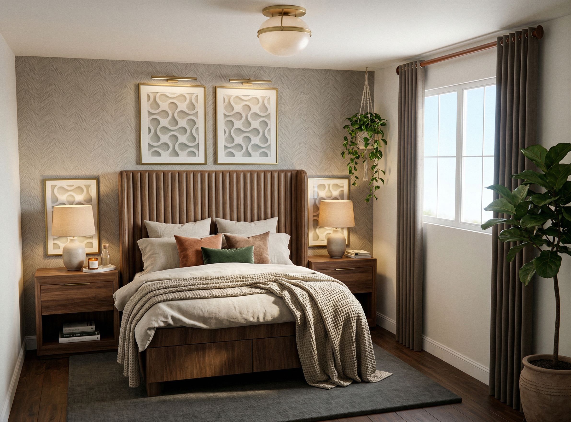 PromptRevamp this bedroom, i want to see a cozy oasis, show me layers, textures, art, plants, warm lights, ceiling light, accent wallpaper, keep exact camera angle