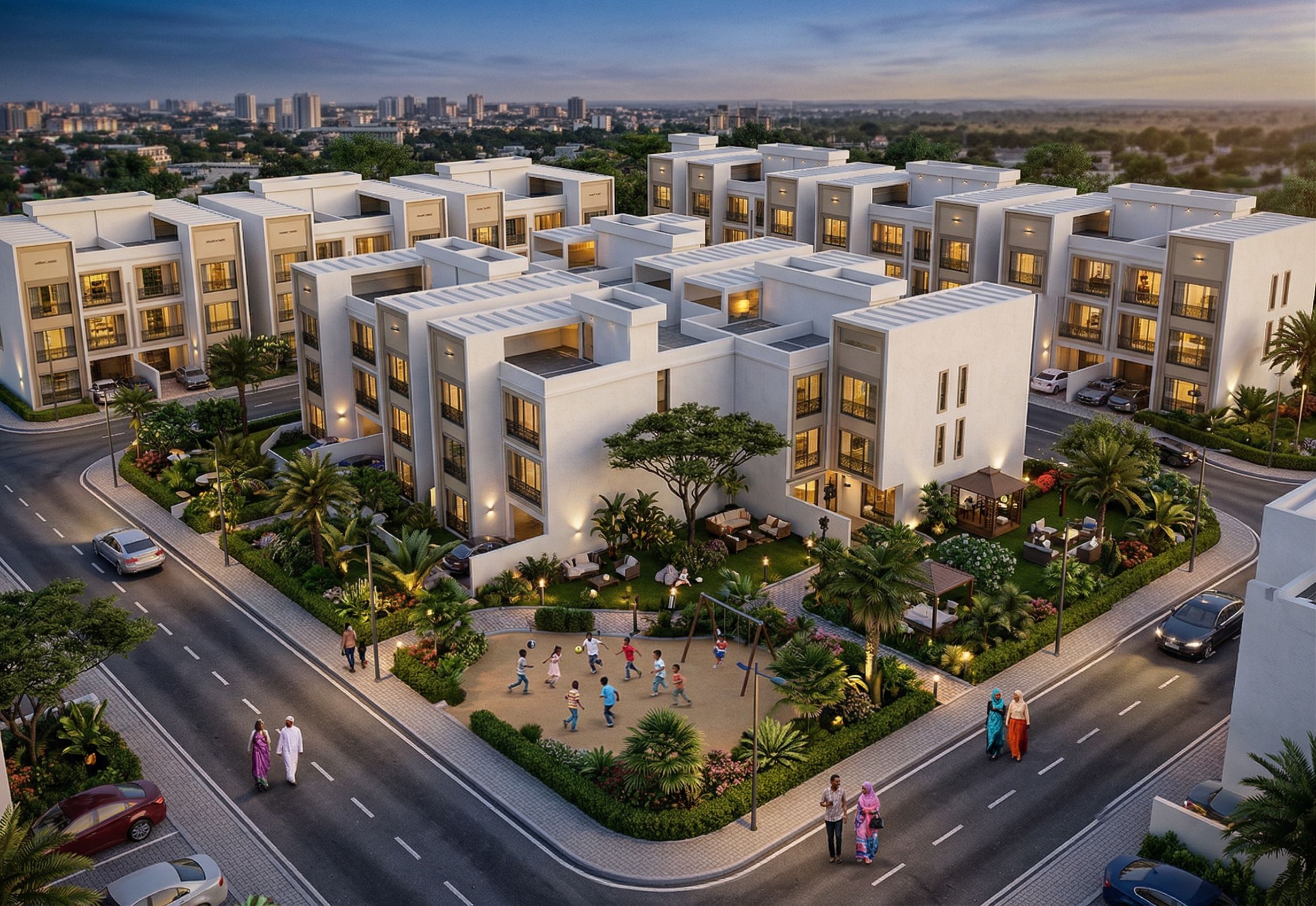 AERIAL VIEW OF AN EXCLUSIVE HIGH END ESATE . INCLUDE MOULDINGS IN WINDOWS AND OPENINGS. USE BAIGE AND DARKER SHADES OF BEIGE IN THE MOULDINGS. MAKE THE GLASS REFLECTIVE AND REALISTIC . INCLUDE ROADS, GARDENS, CHILDREN PLAYING. ADULTS OF SOMALI AND AFRICAN ORIGIN WALKING ON THE STREETS. SITTING AREAS AND LANDSCAPING. USE BRILLIANT WHITE WALL MASTER ON BUILDING AND MAKE IMAGE HIGH RESOLUTION 8K. INCLUDE SOME GARDEN LIGHT, SPOT LIGHTS AND STREET LIGHTS. TURN ON THE LIGHTS., keep exact camera angle